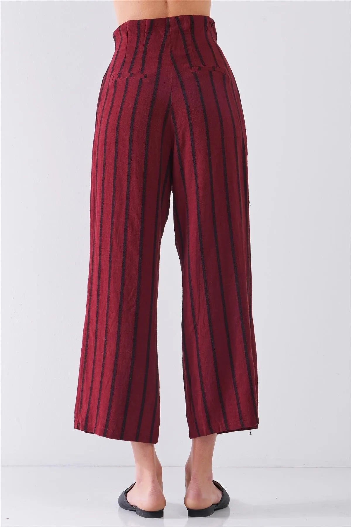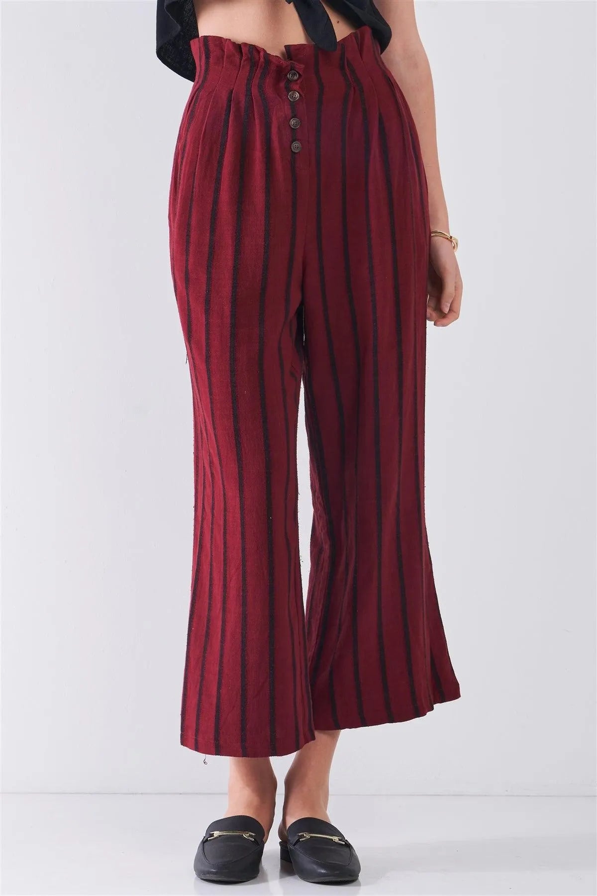 Wine & Black Linen Striped Frill Hem Button-Down High Waist Wide Leg Capri Pants /3-2-1