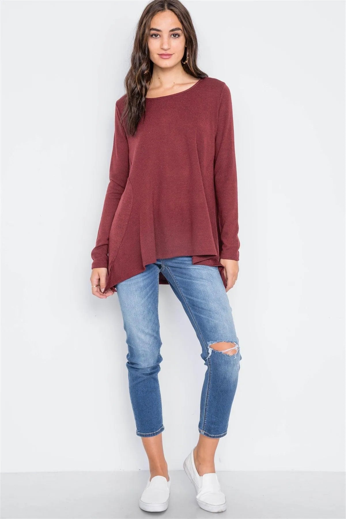 Wine Long Sleeve Loose Fit Solid Top