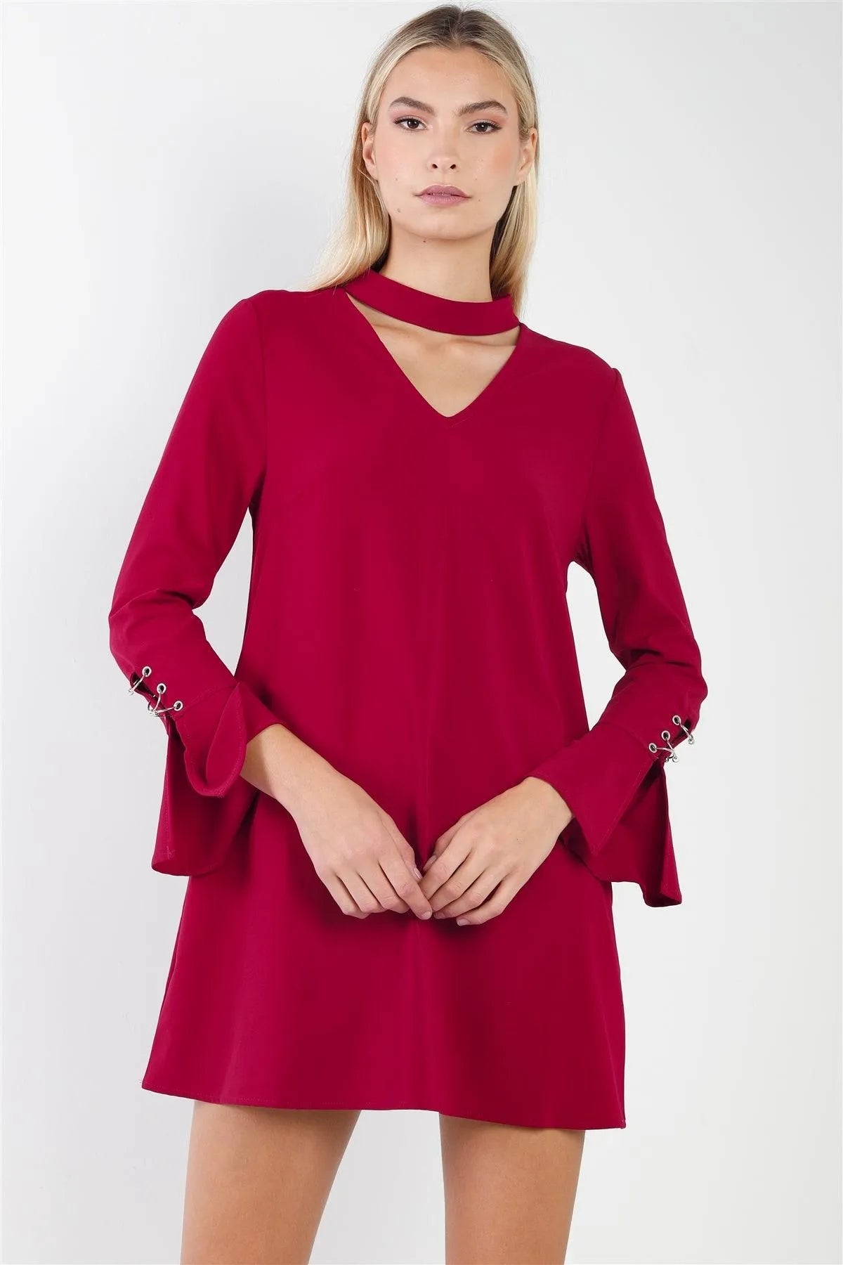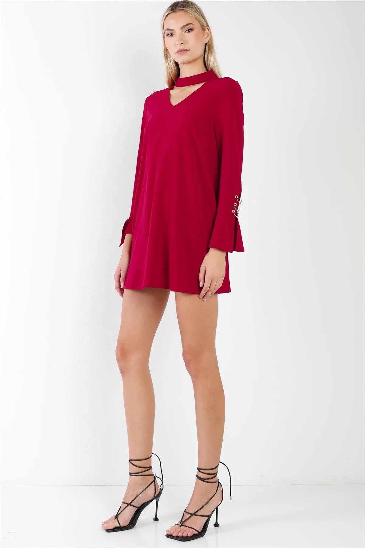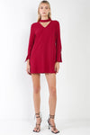 Wine Long Sleeve V-Cut Out Solid Mini Dress /2-2-2