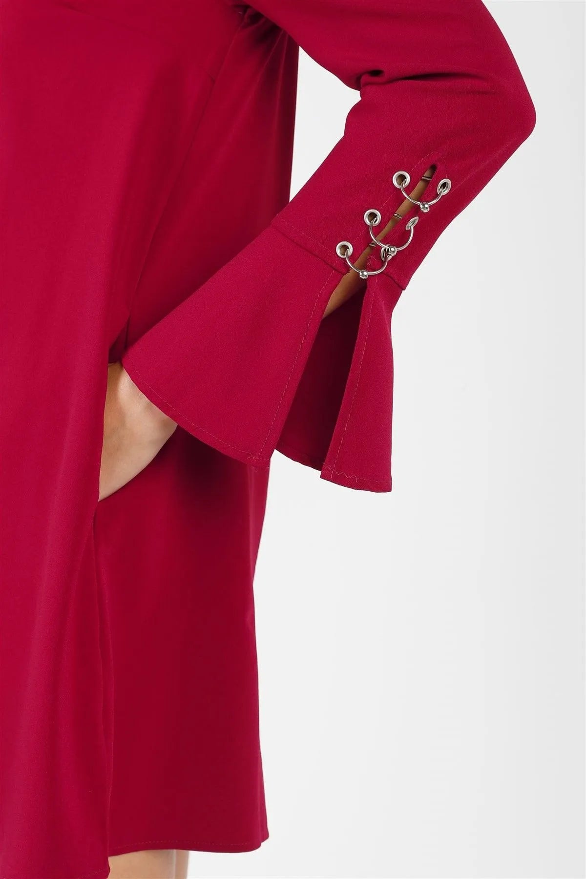 🖤 Item features: Wine, solid color, long sleeves with O-ring detailing at cuffs, mock neck with back button closure, V-cut out, side pockets, mini length, loose fit, unlined, non-stretchy, elegant, casual, trendy, edgy
