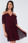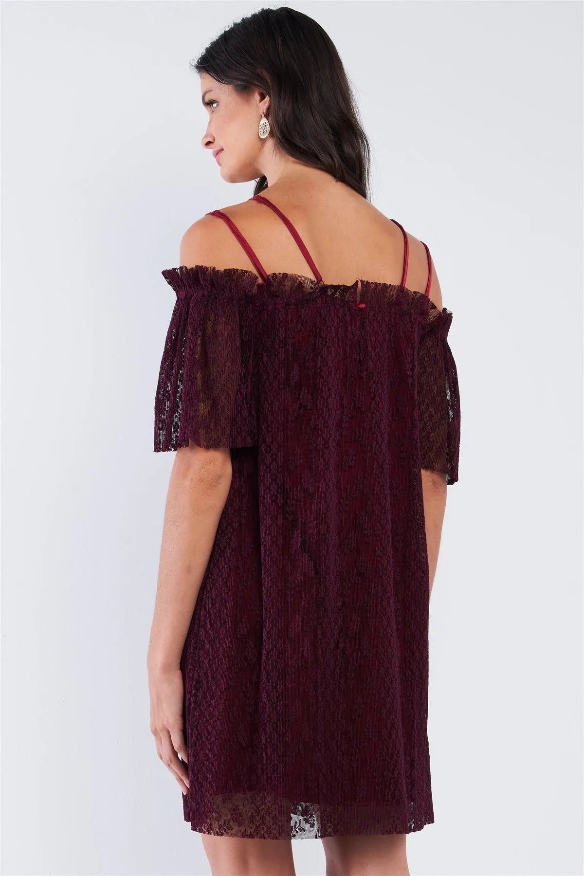 🖤 Item features: Wine red, solid, printed mesh fabric, satin lining, mini length, mini wide sleeve, off-the-shoulder stretchy frill mesh hem, satin adjustable multi straps, tube tunic style dress, casual chic, party wear, spring/summer collection