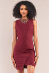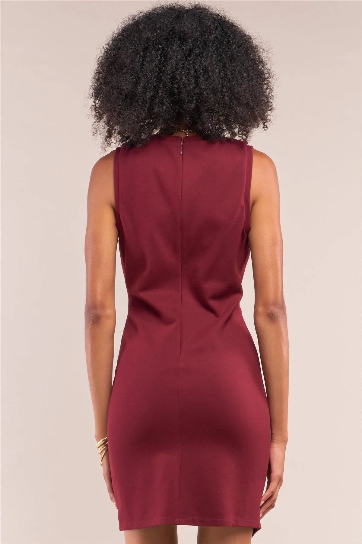 Wine Red Sleeveless Asymmetrical Hem Crew Neck Fitted Mini Dress /1-2-2-1