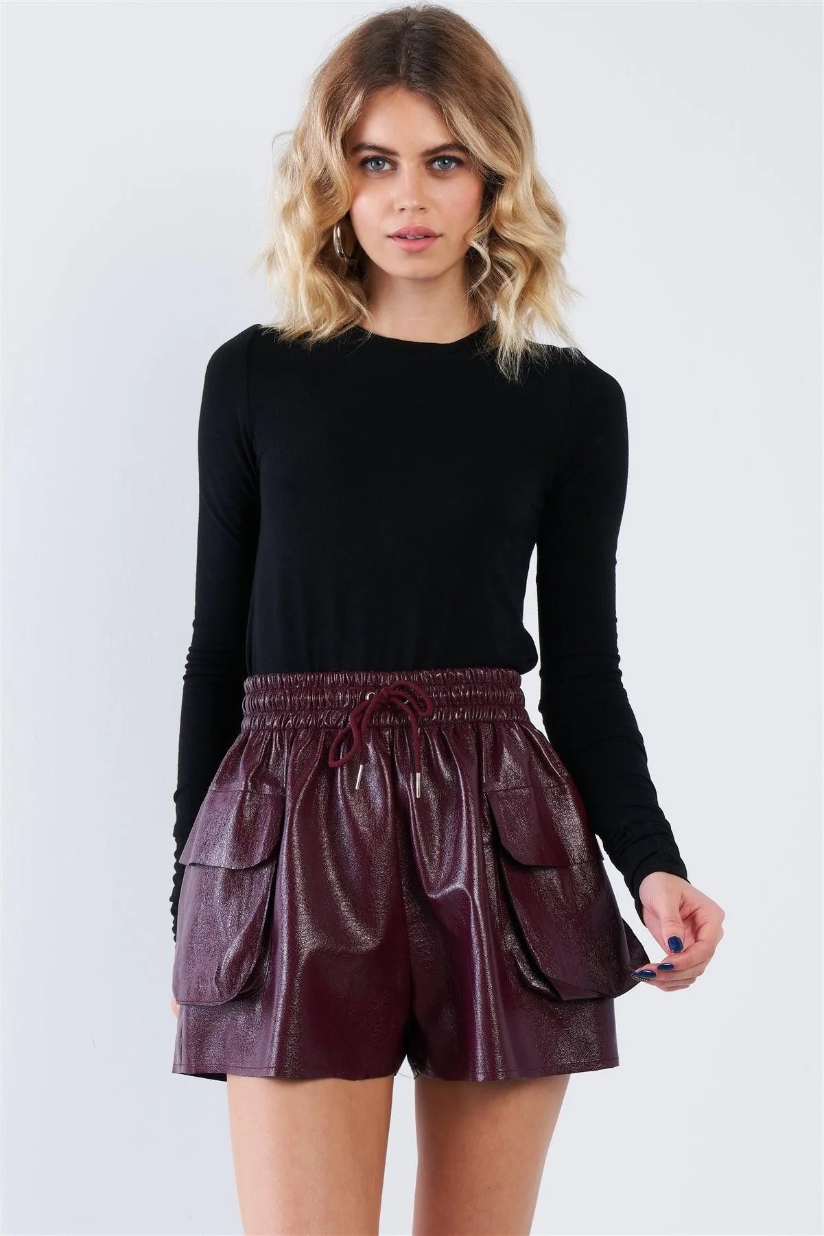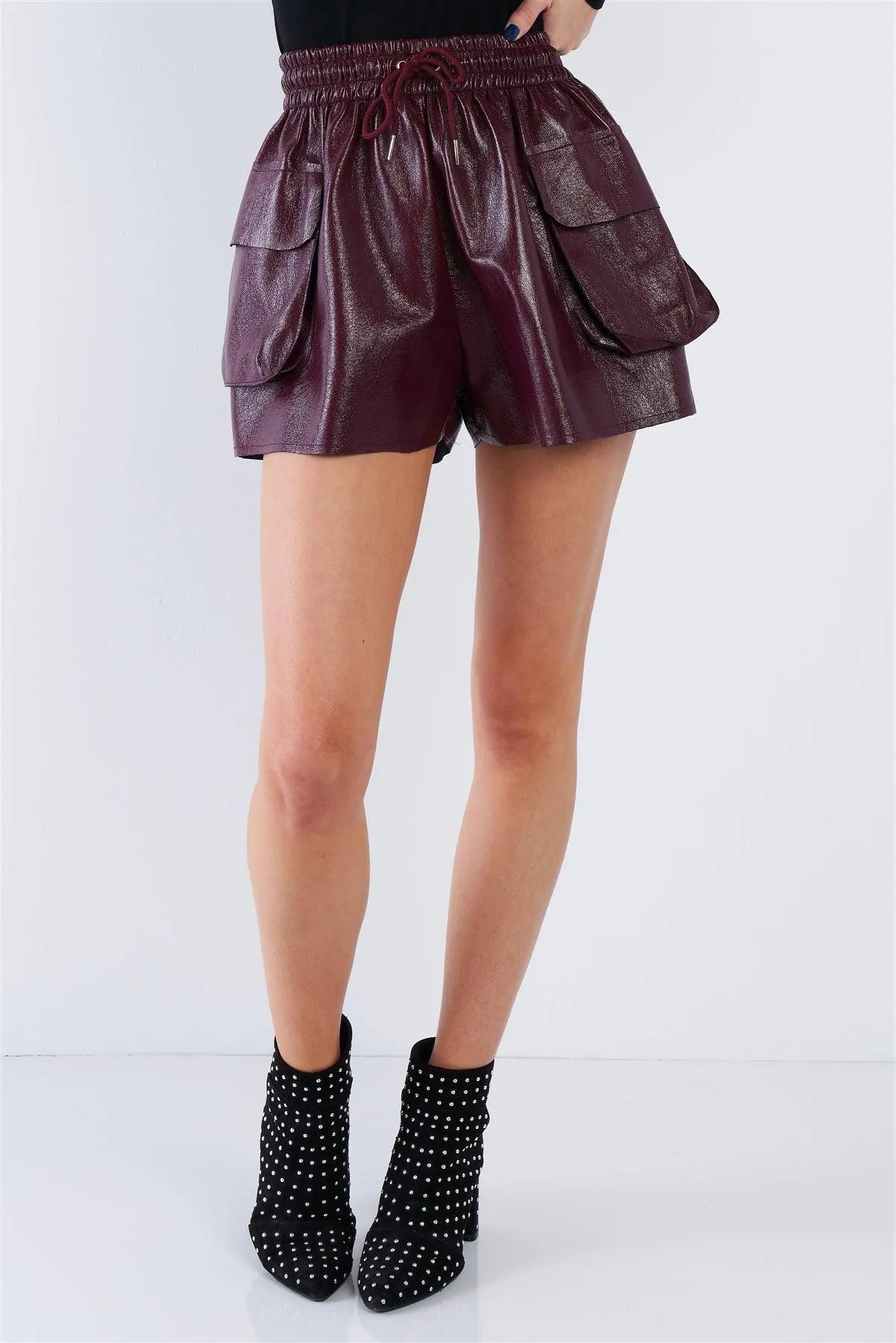 Wine Red Crinkled Faux Leather Cargo Shorts