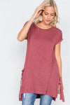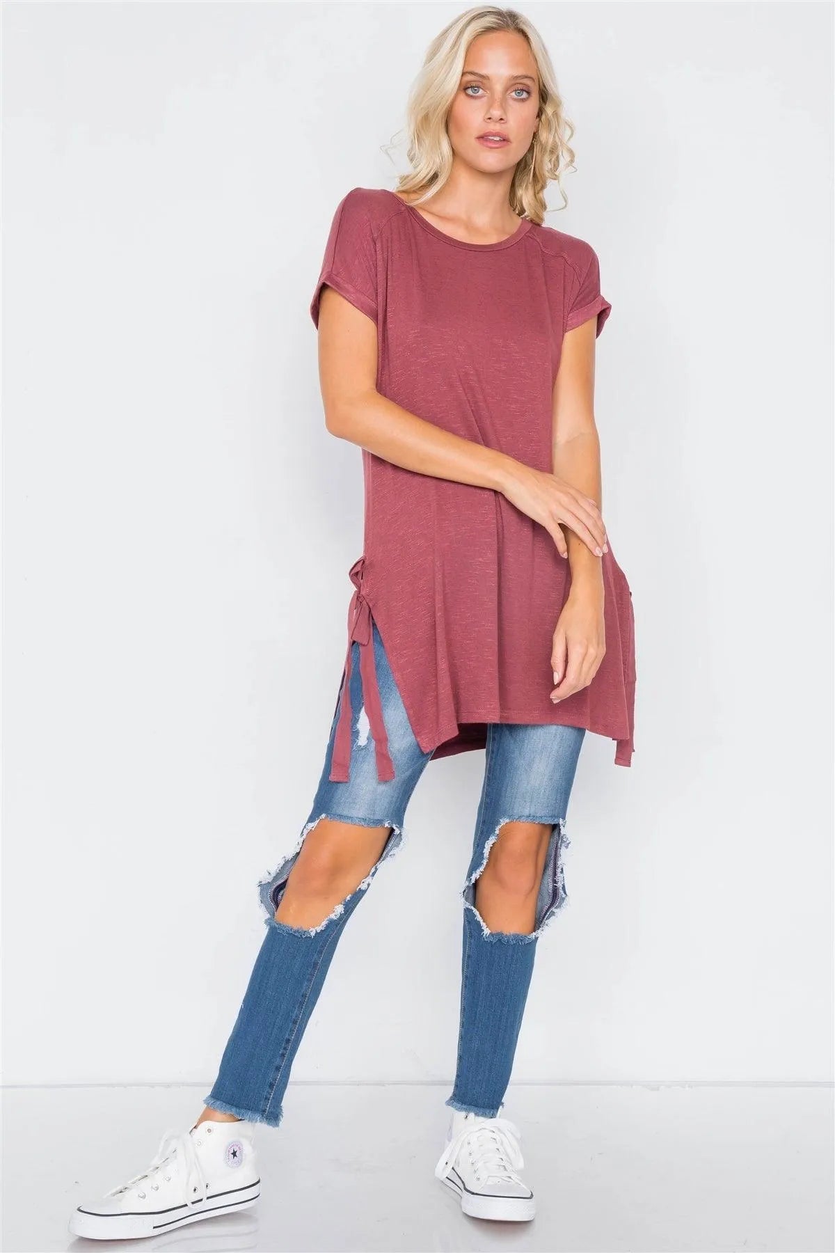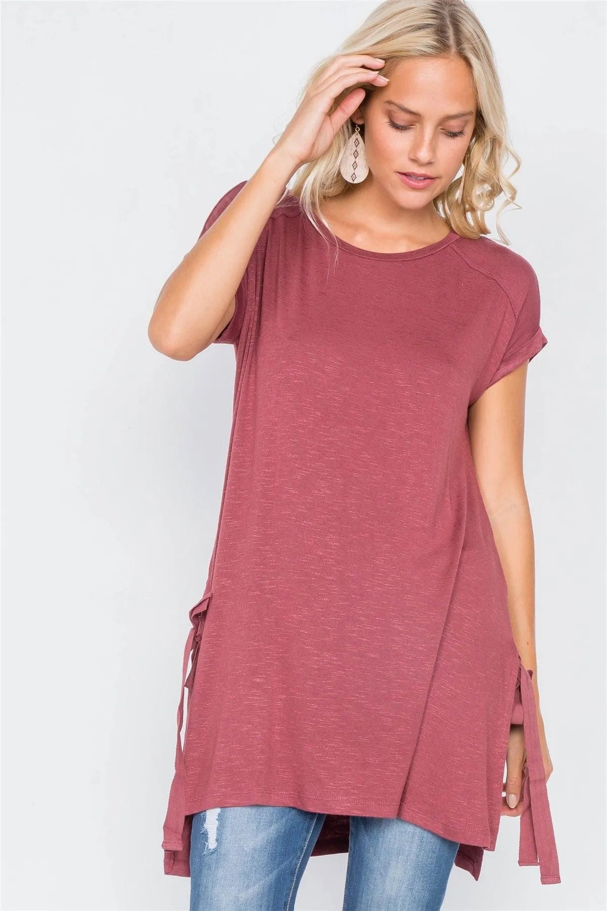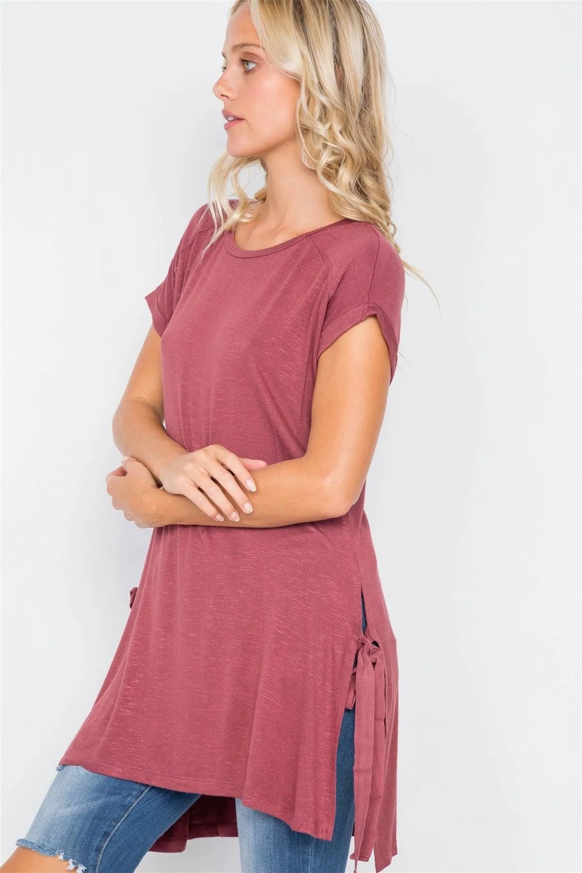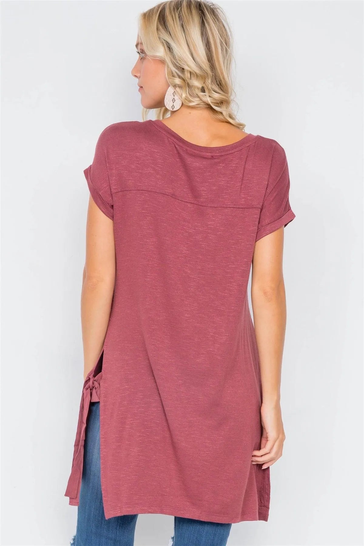 Wine Rose High-Low Rolled Sleeves Side Slit Self-Tie Tunic Top /1-3-2