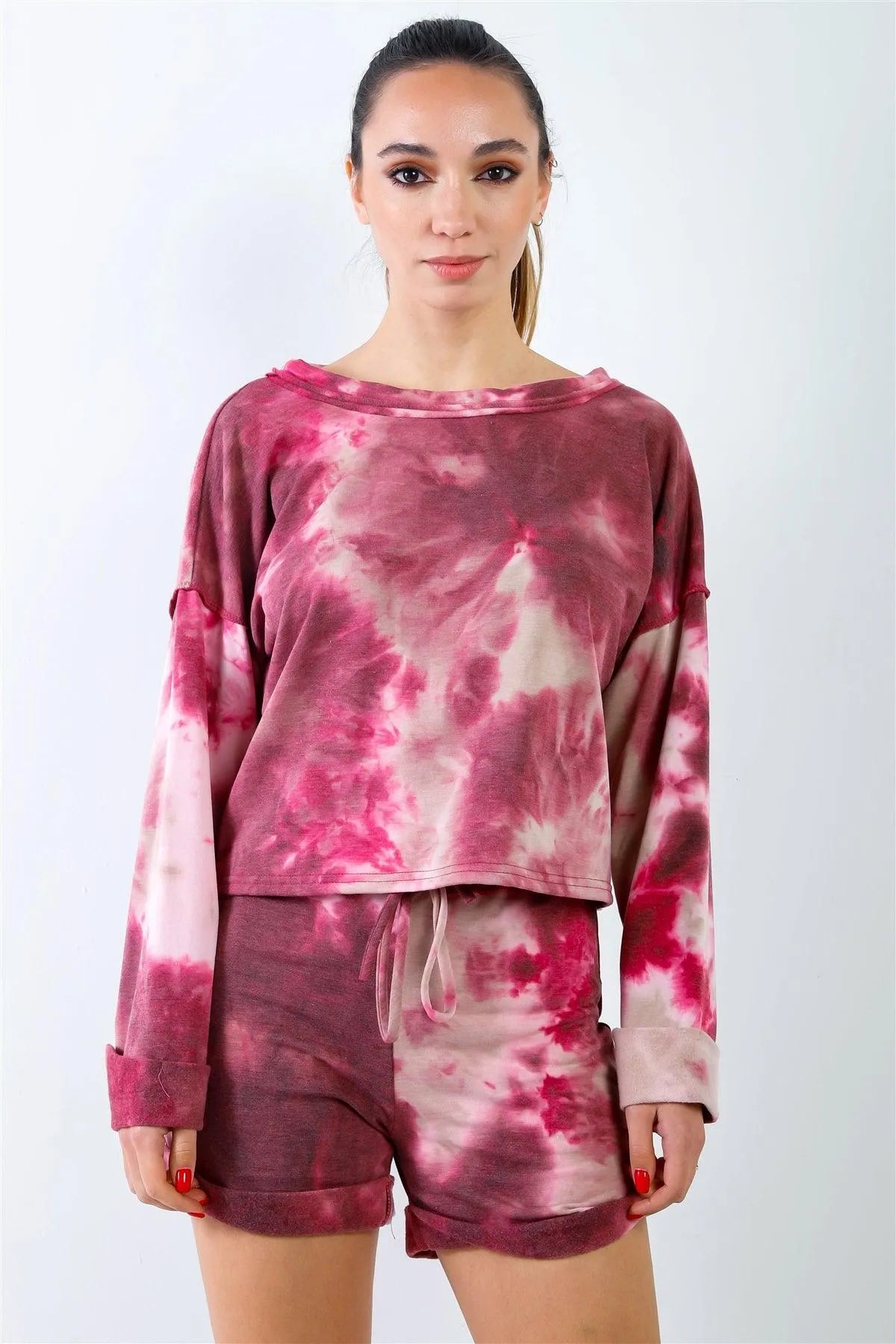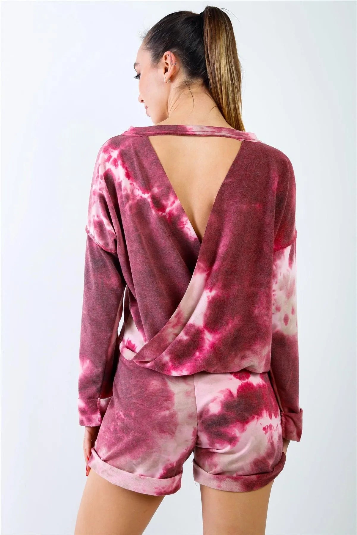 Wine & Sand Tie-Dye Inside Out Wrap Open Back Sweatshirt & High Waist Shorts Set /3-2-1