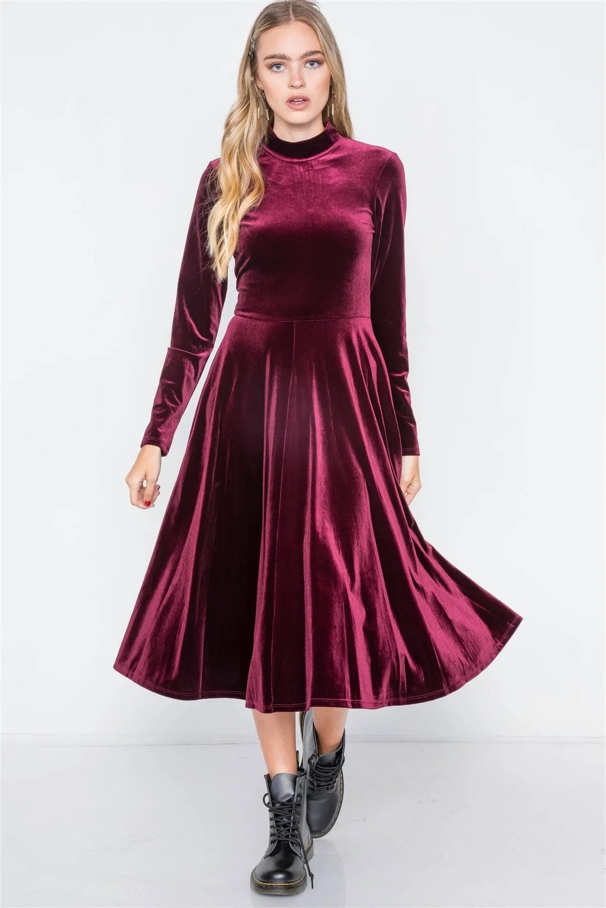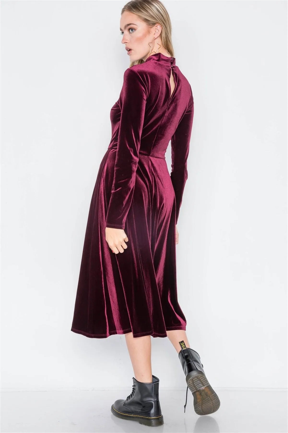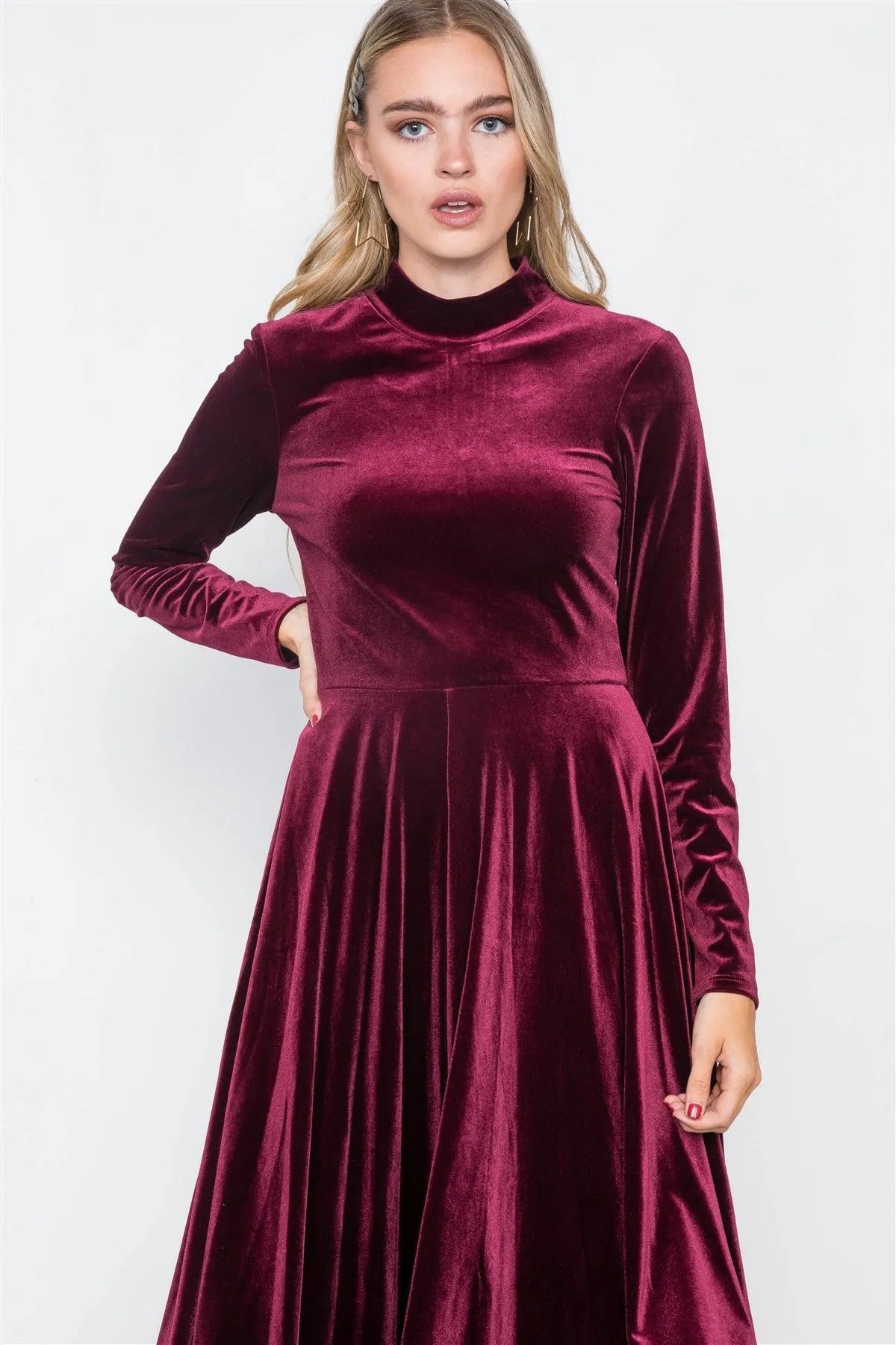 Wine Velvet Long Sleeve A-Line Midi Evening Dress
