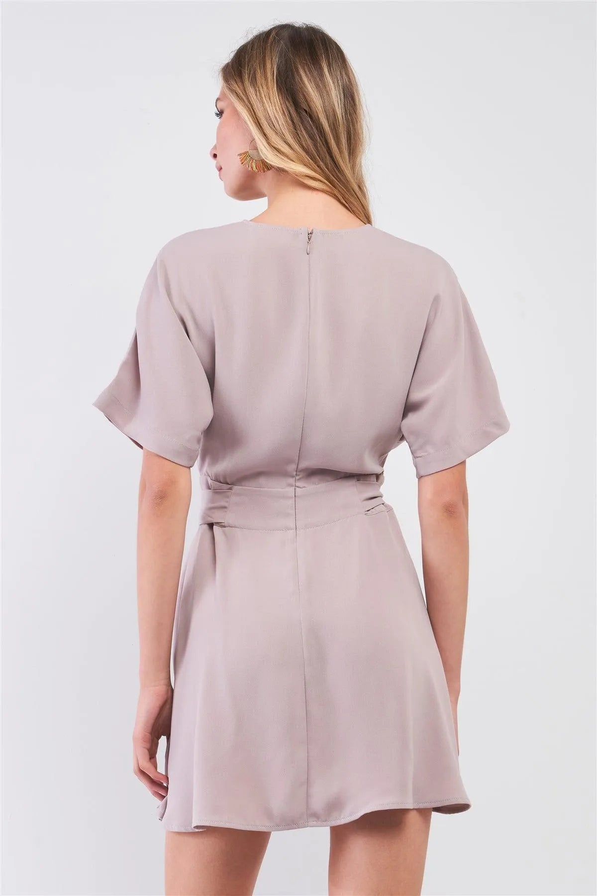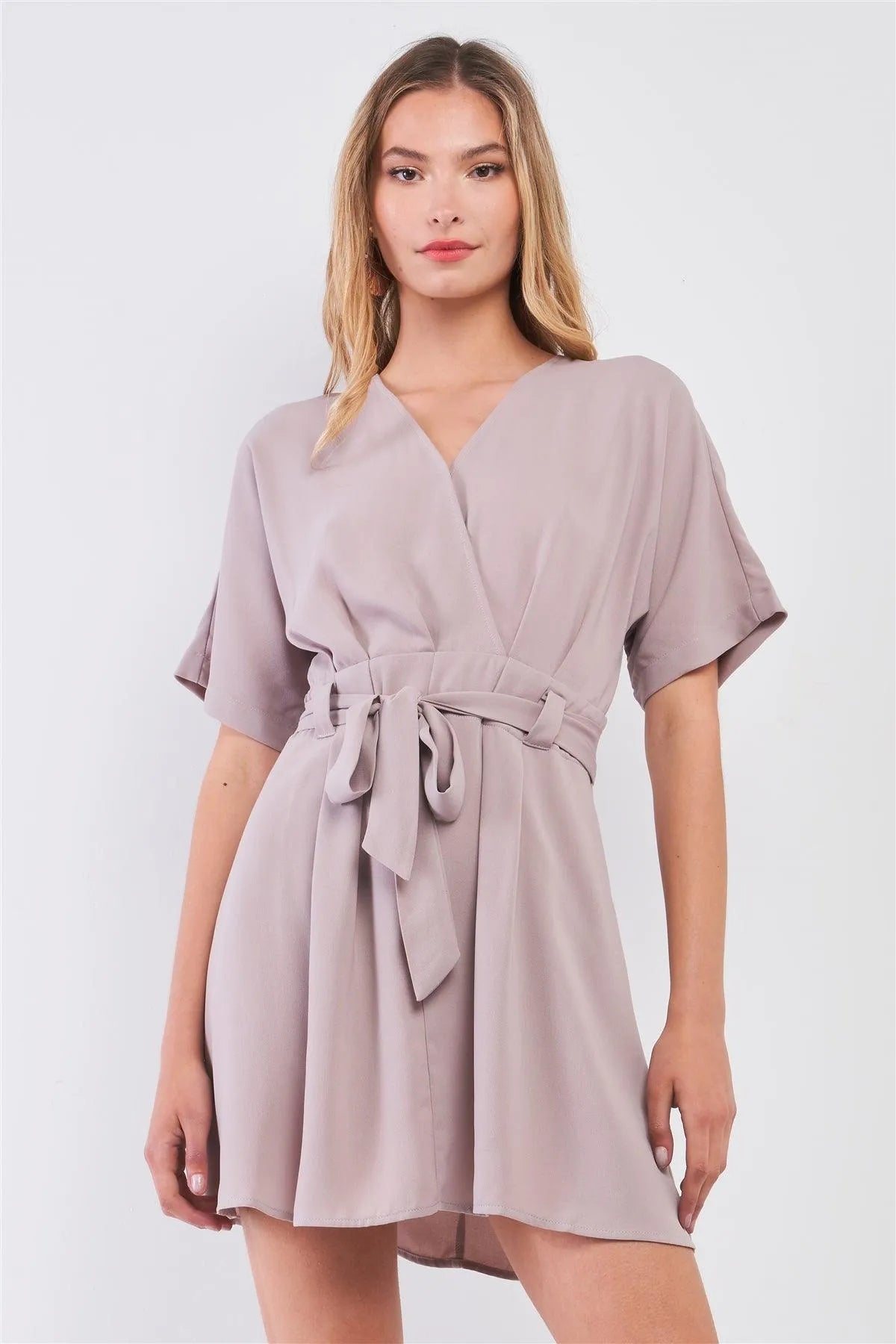 🖤 Item Features: Winter grey, solid color, wide short sleeve, wrap V-neckline with inner clasp button closure and back inner hook & eye closure, back zipper closure, pleated, undetachable self-tie belt with belt loops, flare cut, regular fit, mini length, unlined, non-stretch, non-sheer, casual, business casual, elegant, cute, trendy, spring/summer collection