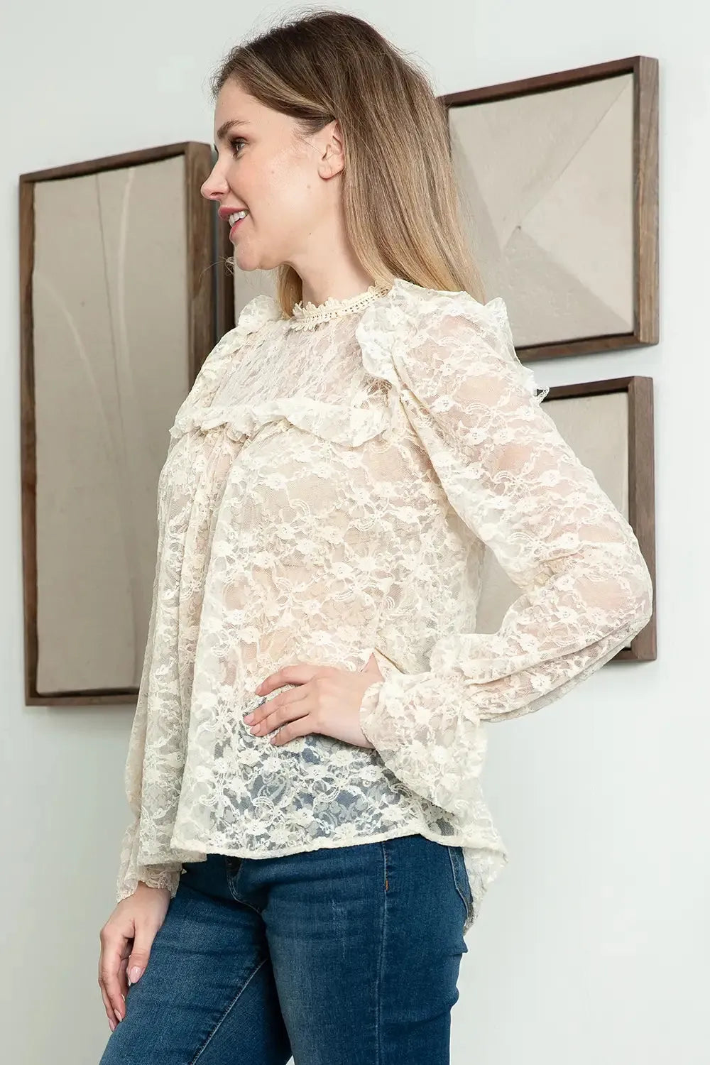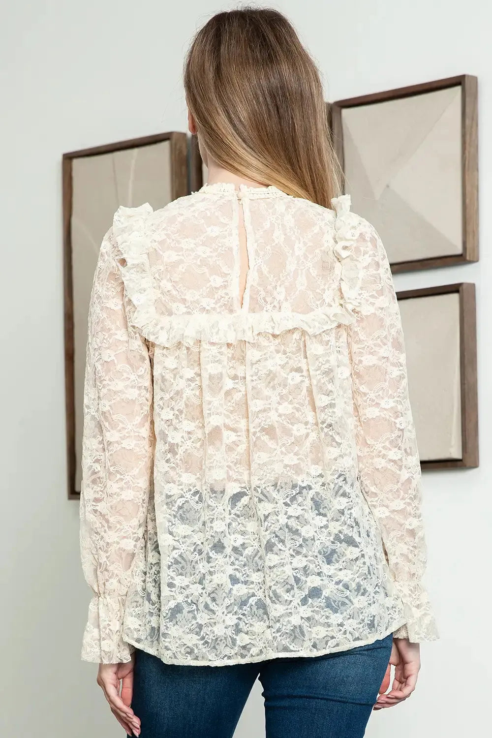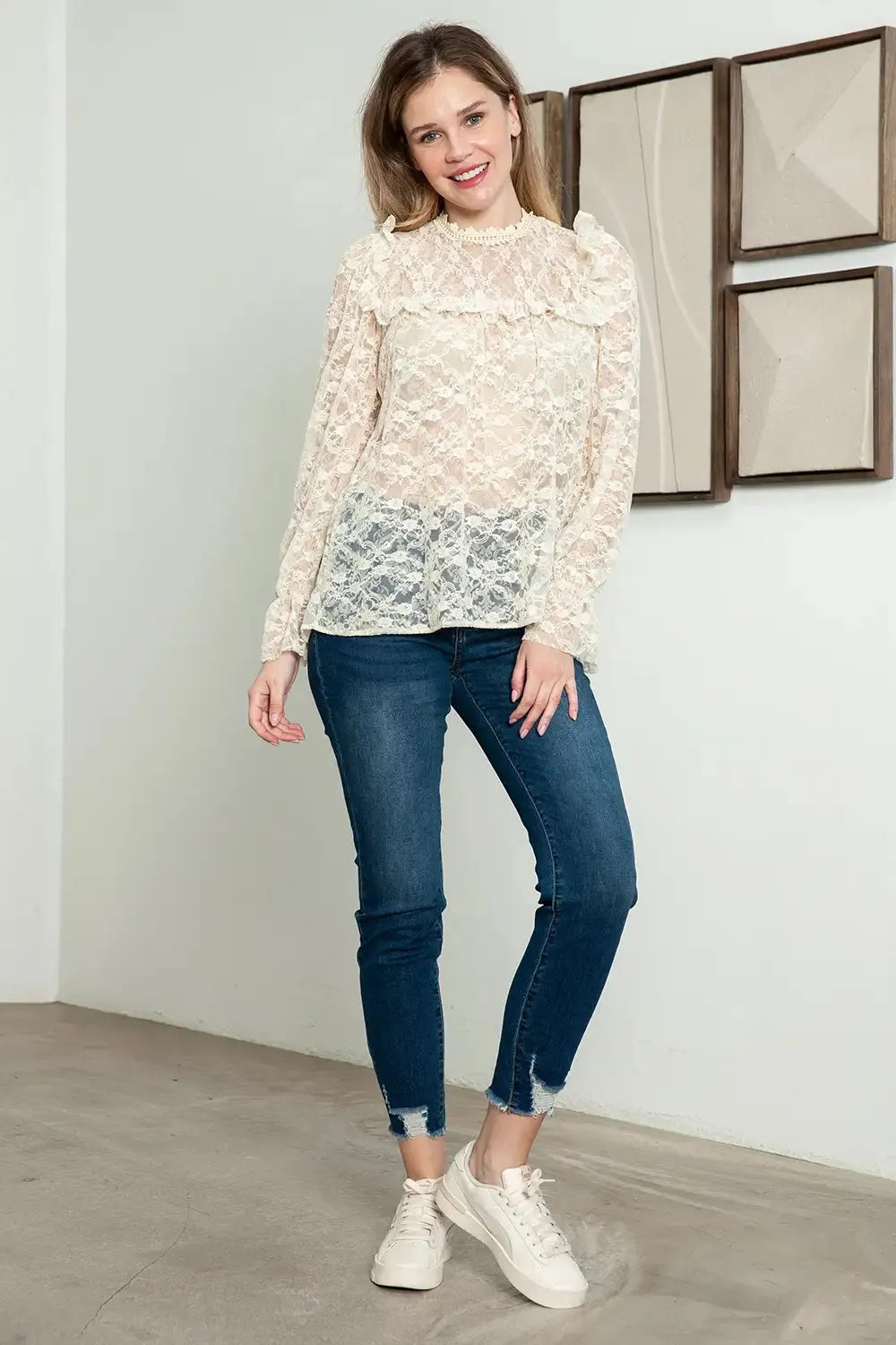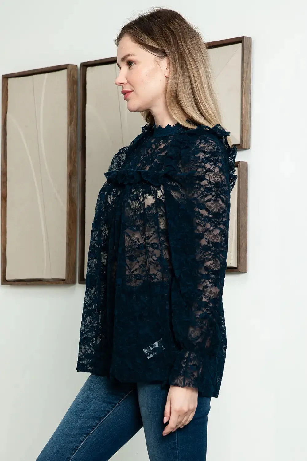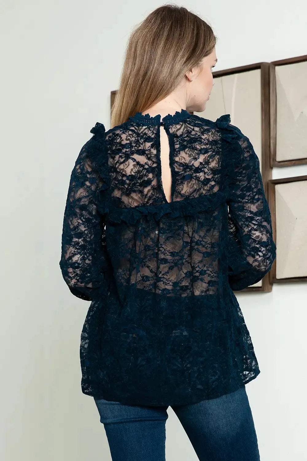 Flutter into feminine elegance with our Vintage Lace Ruffle Babydoll Blouse! This ethereal sheer top features delicate floral lace throughout with charming ruffle details that your boutique customers will instantly adore. Available in classic ivory and rich navy, this versatile statement piece offers that perfect blend of romance and sophistication that fashion-forward women are searching for this season.