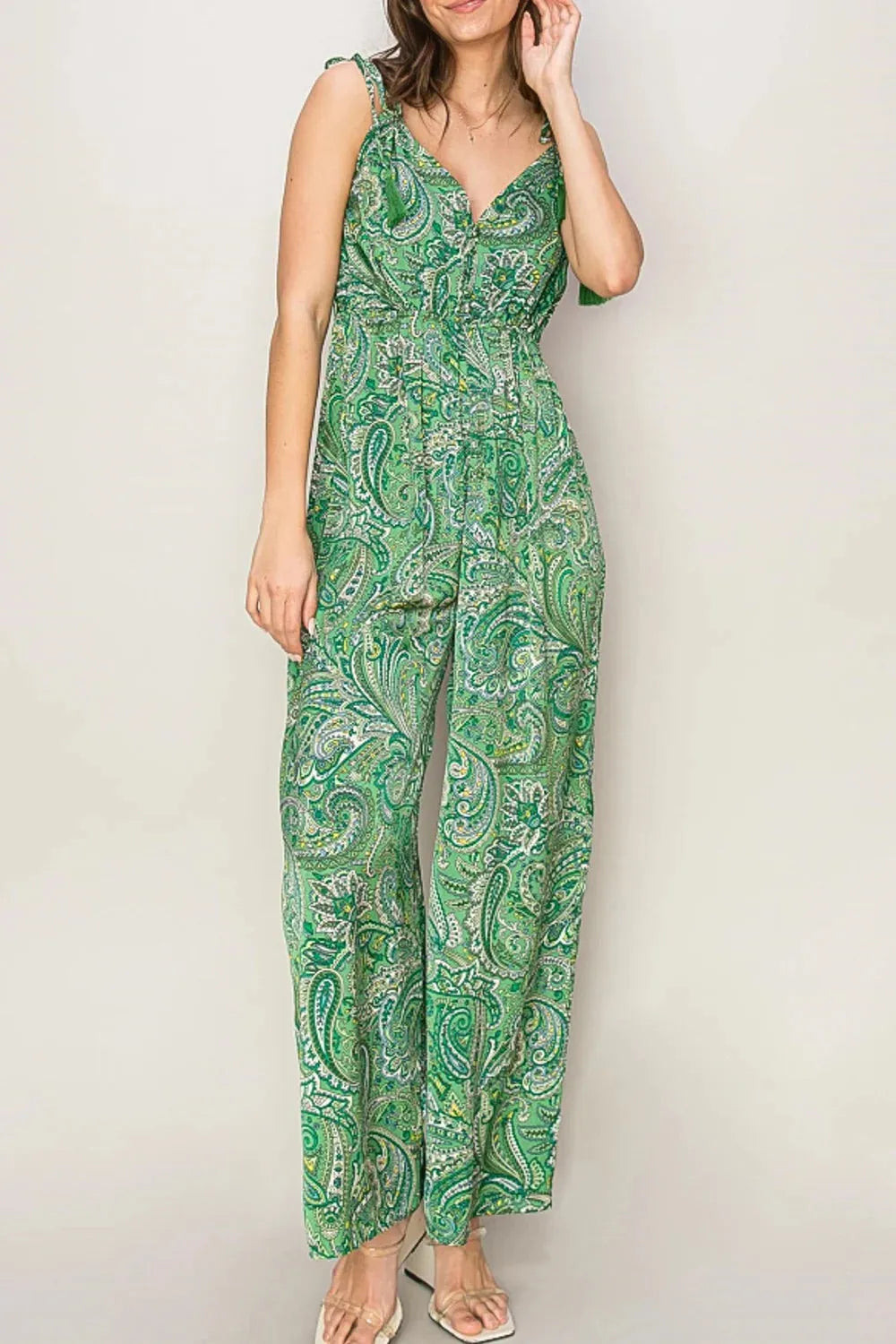 🖤 Features: Satin, breathable fabric, V-neckline, sleeveless design, paisley pattern, tassel-embellished shoulder strap, flowy wide-leg silhouette, front button, easy-care material.