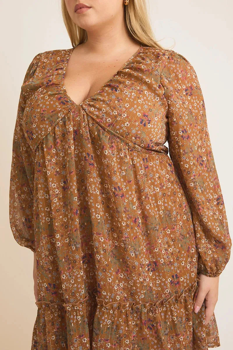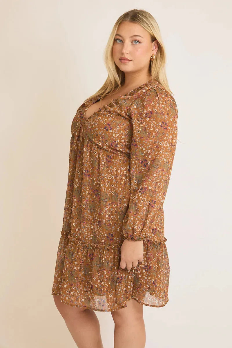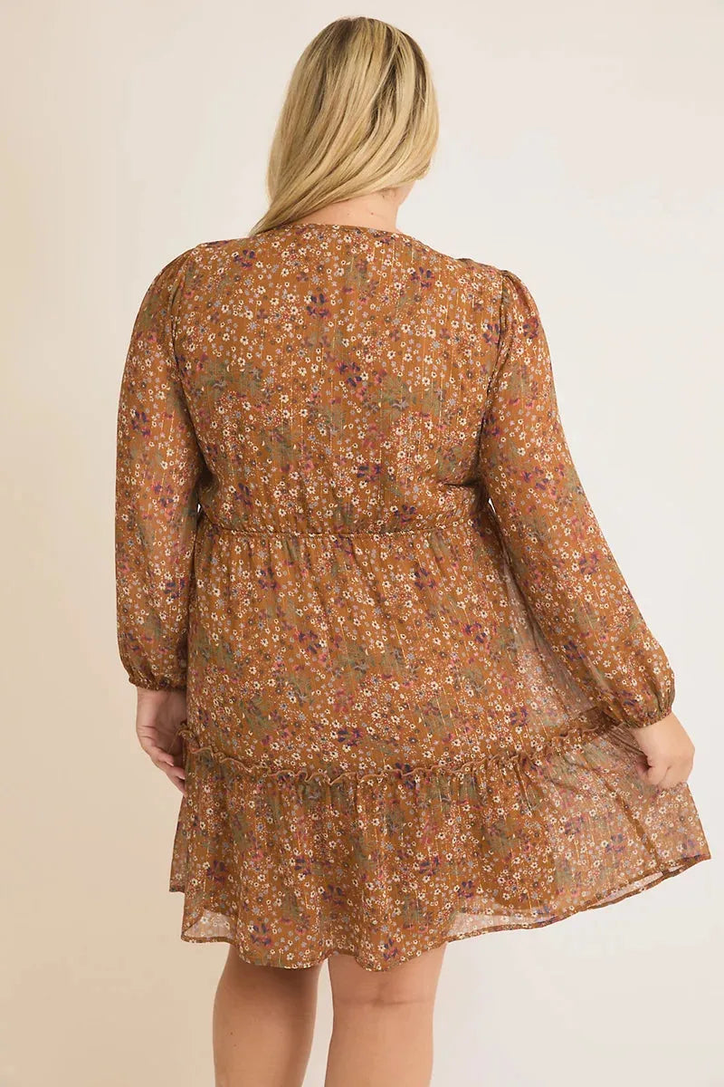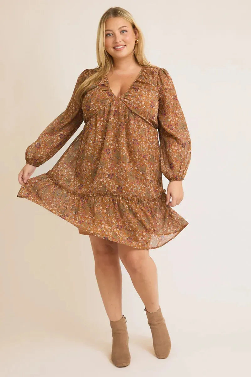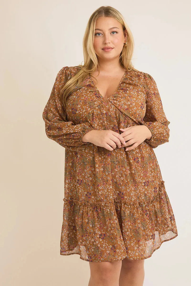 plus size summer dress: mini length, long sleeve, floral pattern, tiered ruffle hem, Shirring Detail, lined. Stay stylish and comfortable all summer long with this beautiful dress, designed to make you feel effortlessly elegant!