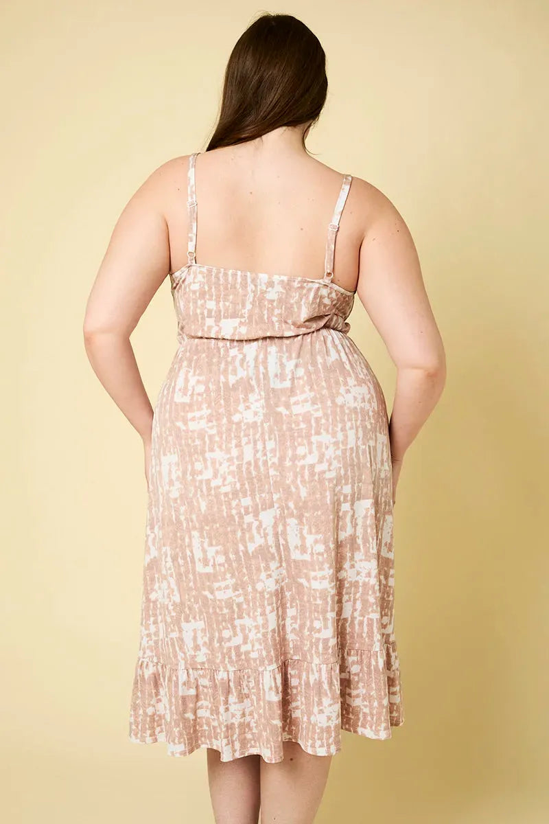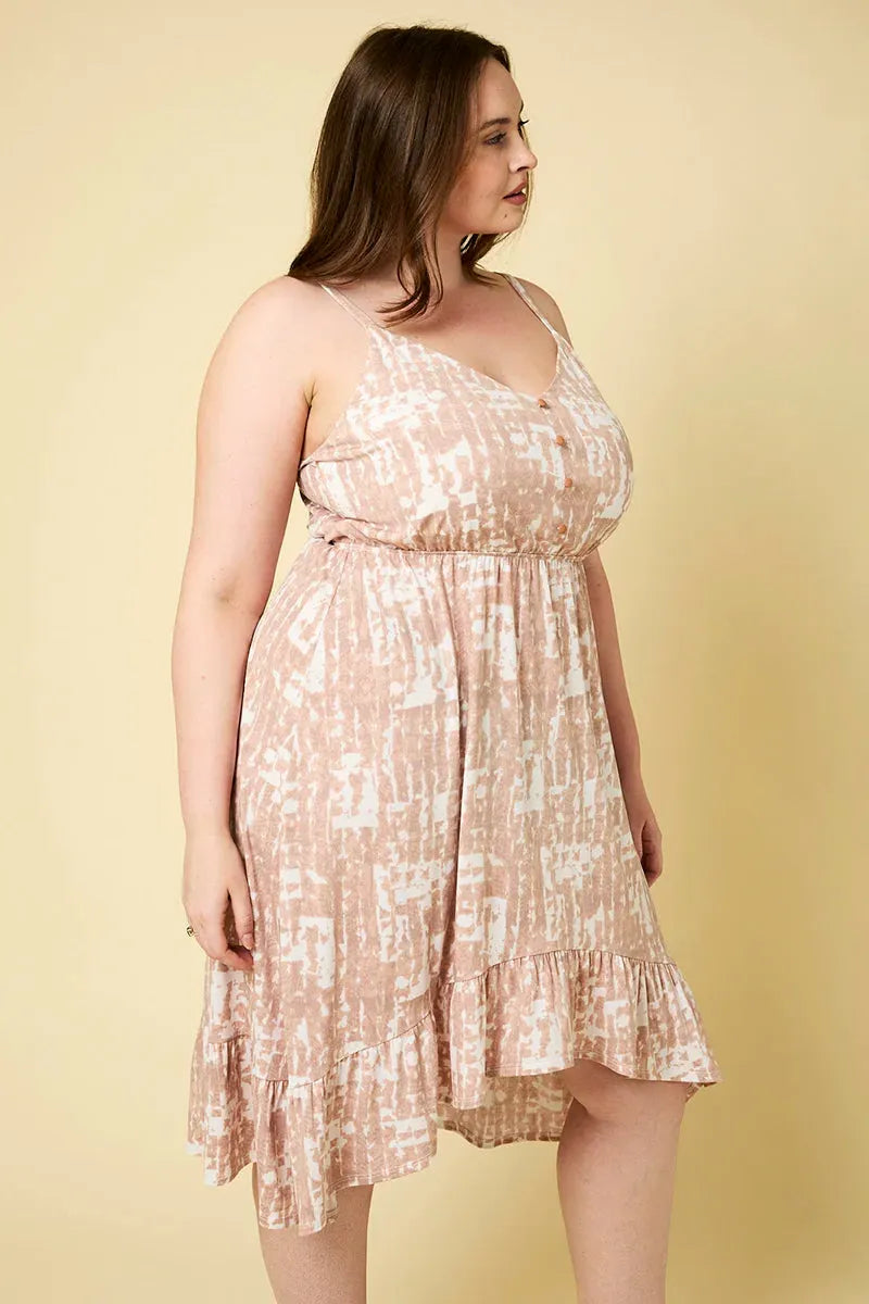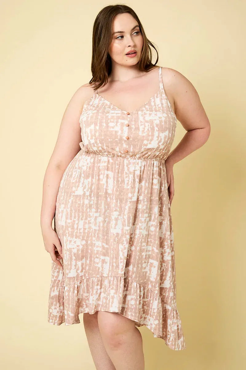plus size summer dress: mini length, sleeveless, tie dye pattern, tiered ruffle hem, elastic waist, lined. Stay stylish and comfortable all summer long with this beautiful dress, designed to make you feel effortlessly elegant!