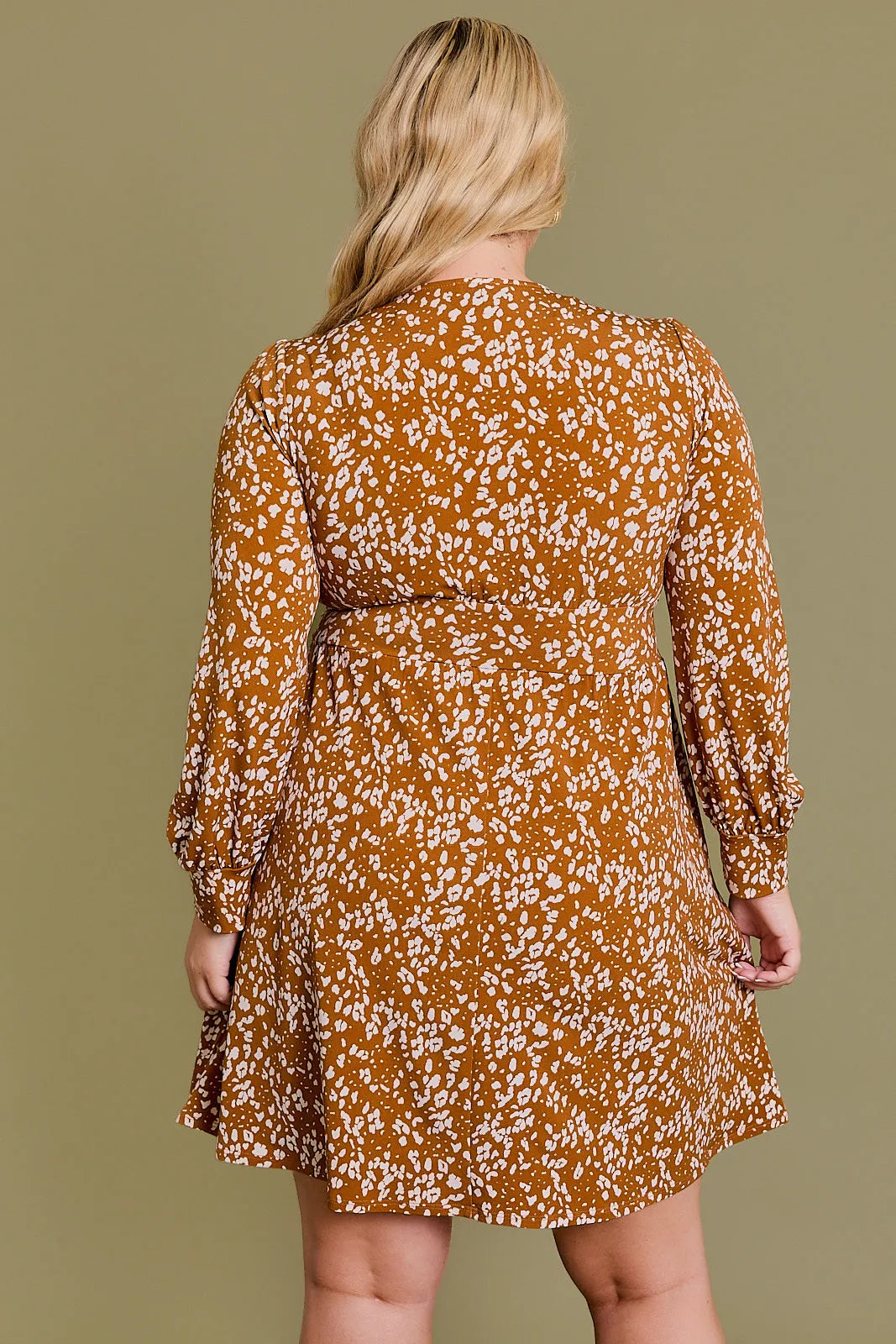 Plus Size Rust Brown Abstract Print Long Sleeve Empire Waist Boho Mini DressVendor:GILLI