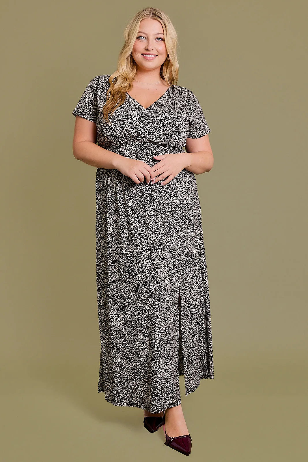 Plus size dress: maxi length, floral pattern, elastic bust line, side slit, short sleeve, wrap bust, stretchy, not see through, cute, vacation, holiday, You are going to love styling this maxi for work, brunch dates, and anything in between!