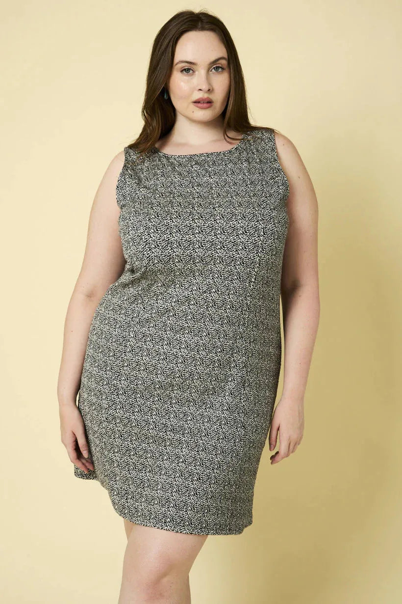 Elevate your boutique's plus size collection with this timeless sheath dress. Featuring a sophisticated black and white chevron pattern, this versatile dress transitions seamlessly from office hours to evening events, making it a must-have for your fashion-forward customers.