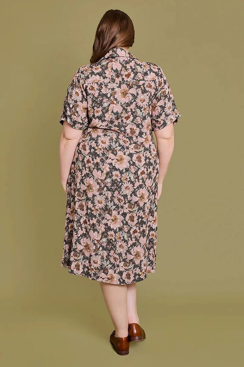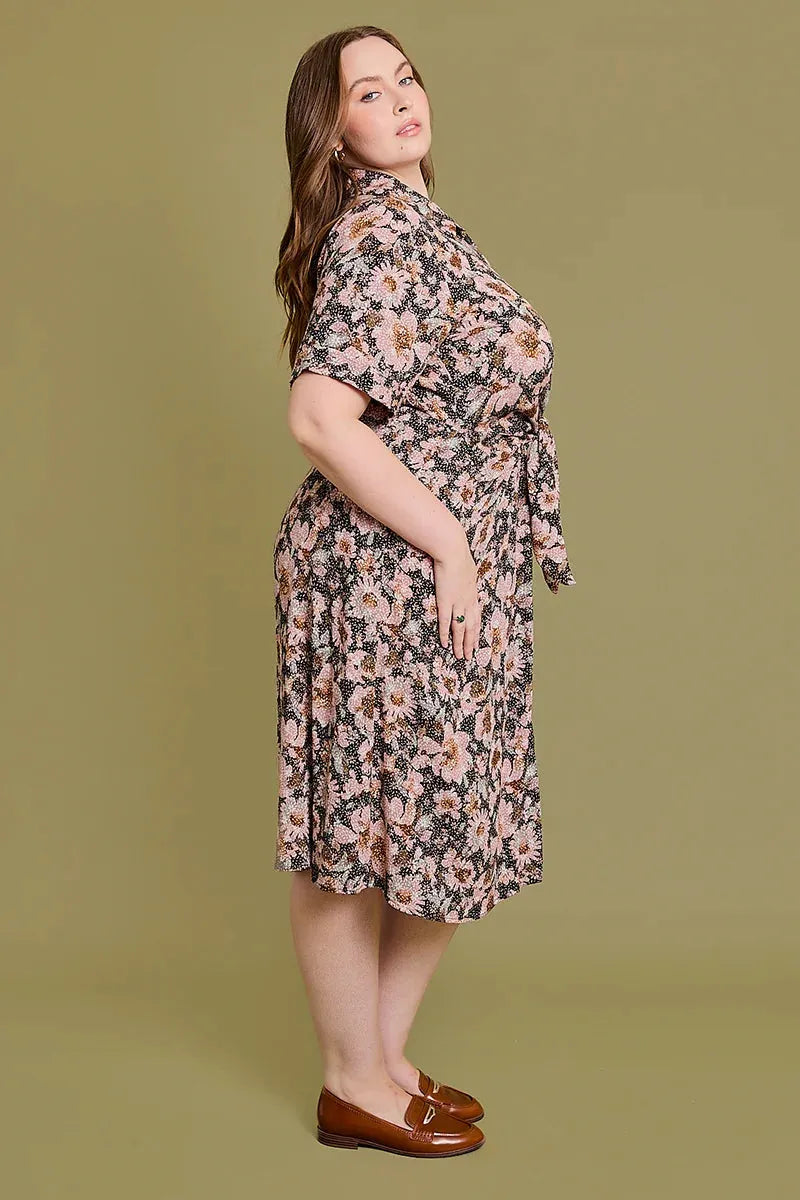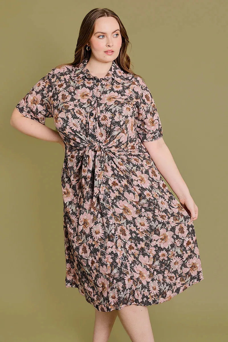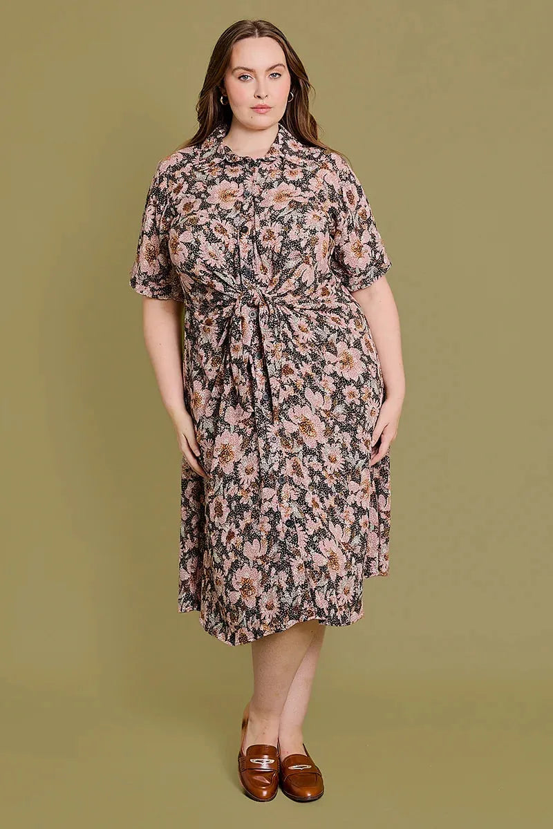 Plus Size Floral Collared Button Down Front Tie Midi Dress