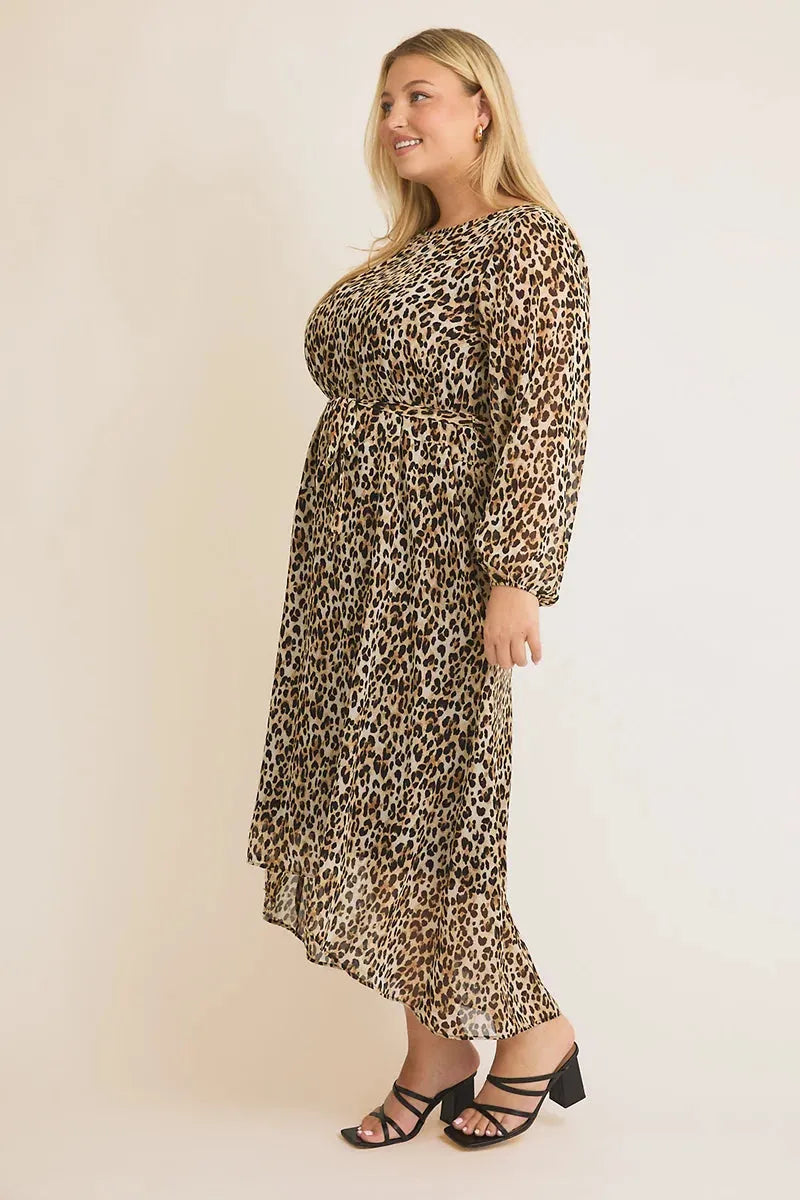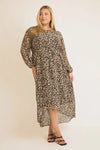 plus size summer dress: midi length, asymmetric, long sleeve, leopard chiffon pattern, front tie, lined, not see through, high-low hem design for a contemporary edge. The perfect blend of elegance and and modern flair.