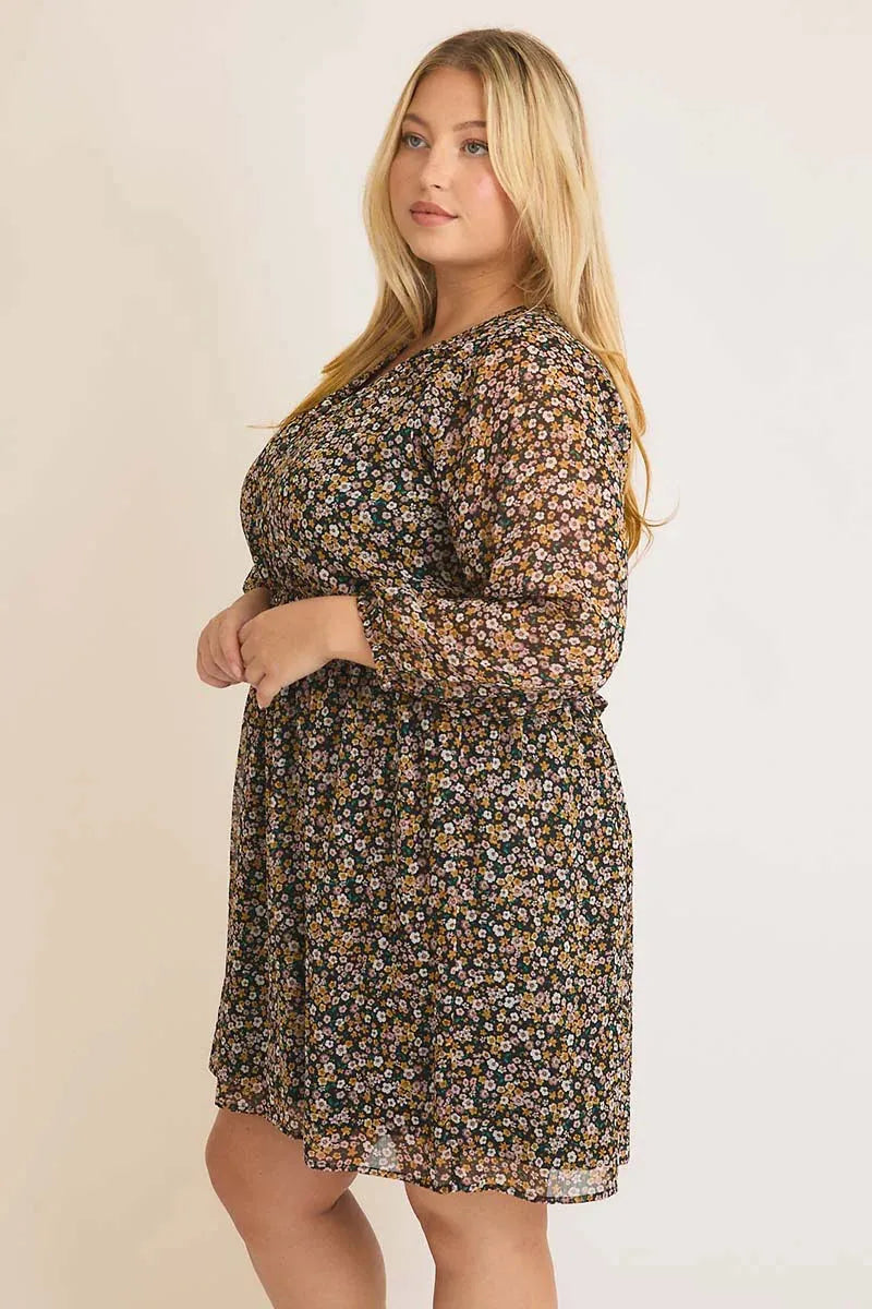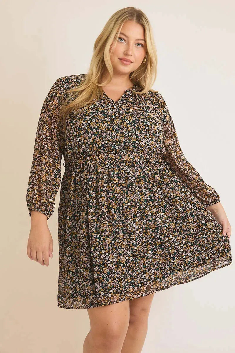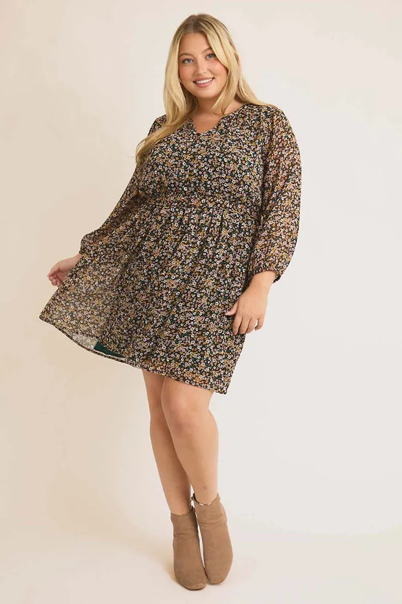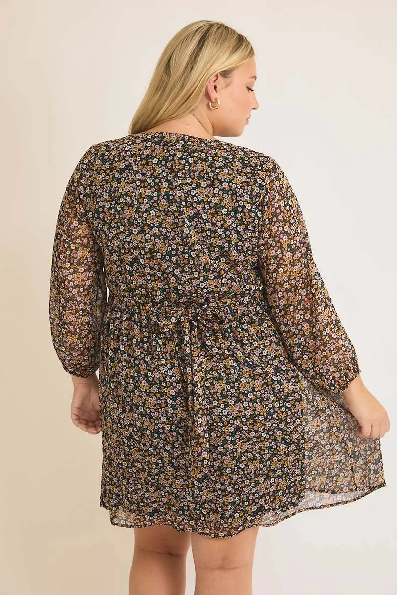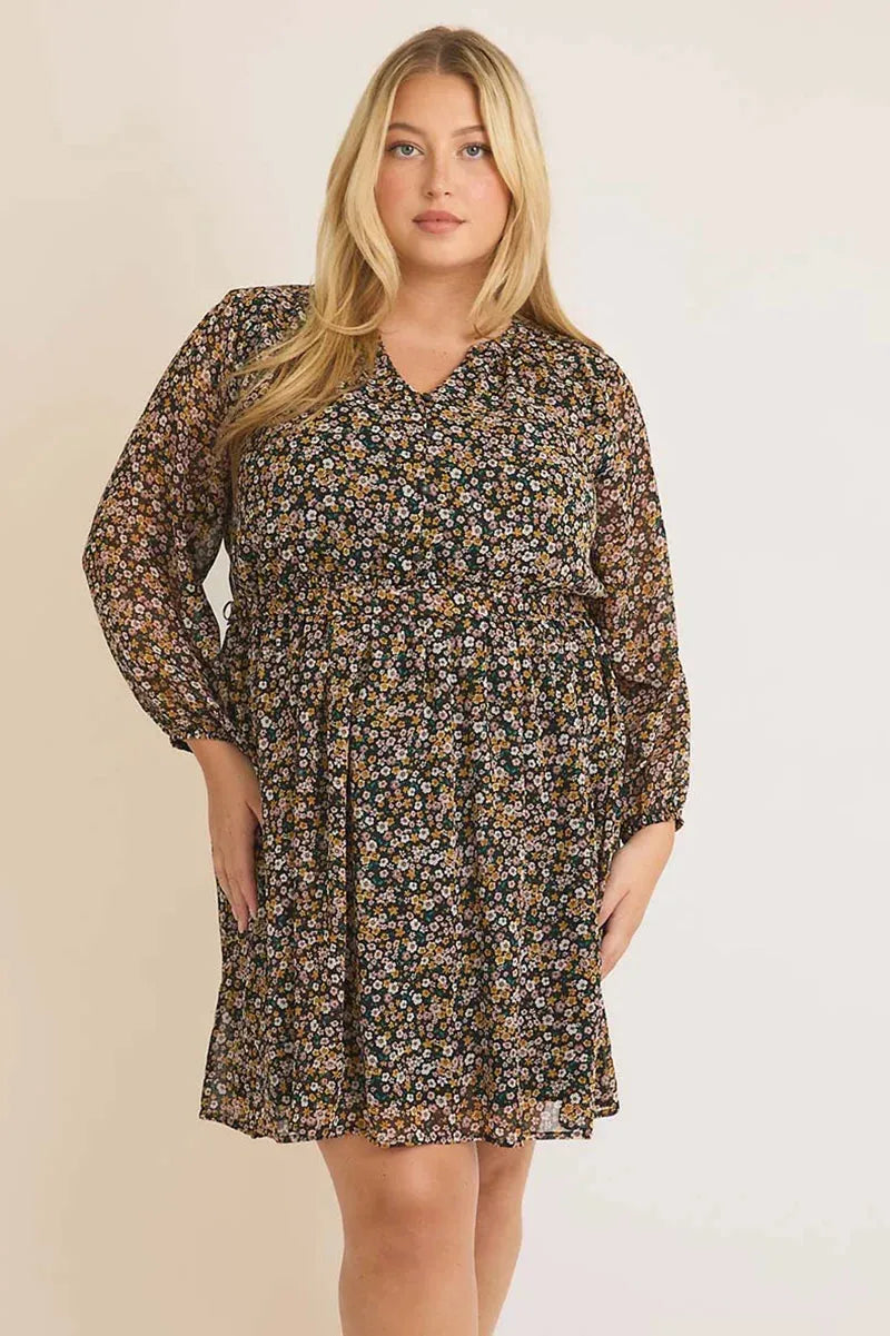 Plus Size Ditsy Chiffon Long Sleeve Buttoned Mini Dress
