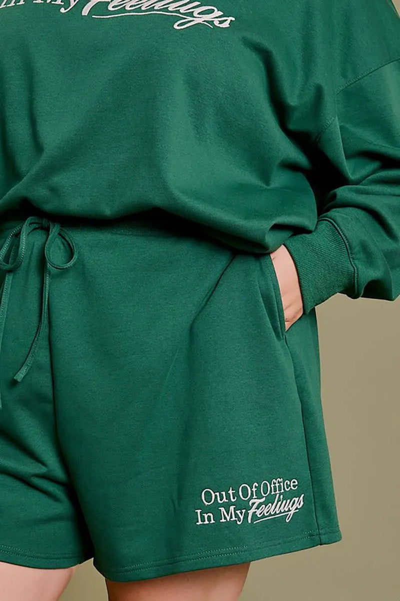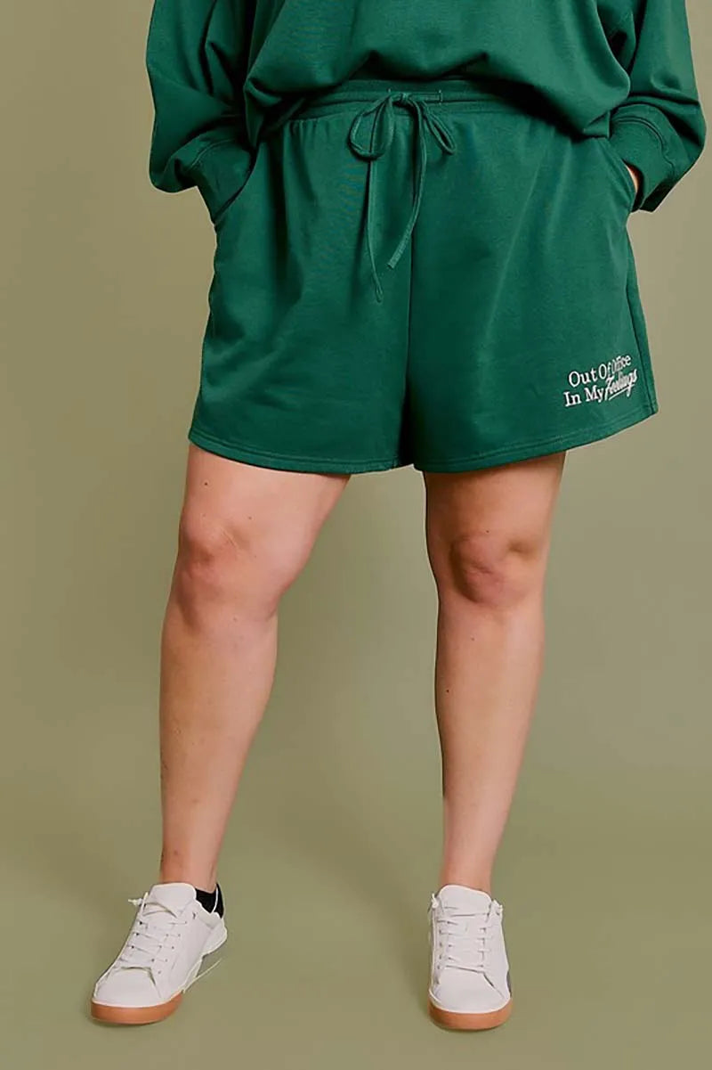 Plus size shorts: solid color, "out of office in my feelings" logo, drawstring, soft, cute, sweet, girly, perfect look for working out or just walk on the beach!