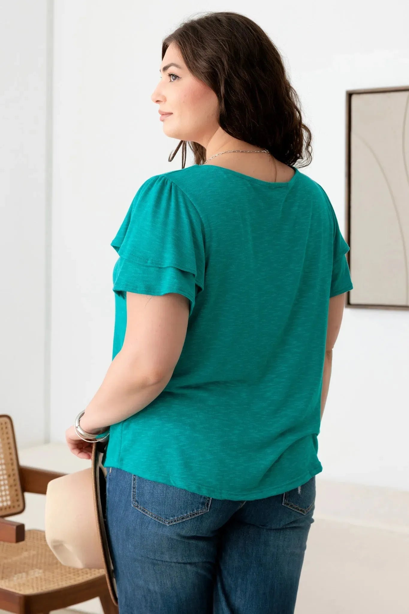 This Plus Size Double Ruffle Short Sleeve Crew Neck Top combines elegance and comfort, designed specifically for curvier figures. The double ruffle sleeves add a touch of femininity, while the classic crew neck ensures a flattering fit. Crafted from soft, breathable fabric, this top is perfect for both casual outings and more polished occasions.