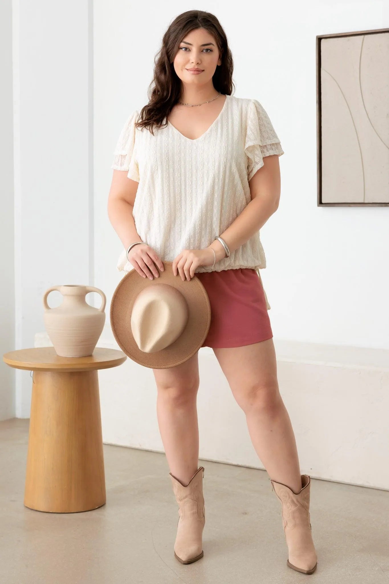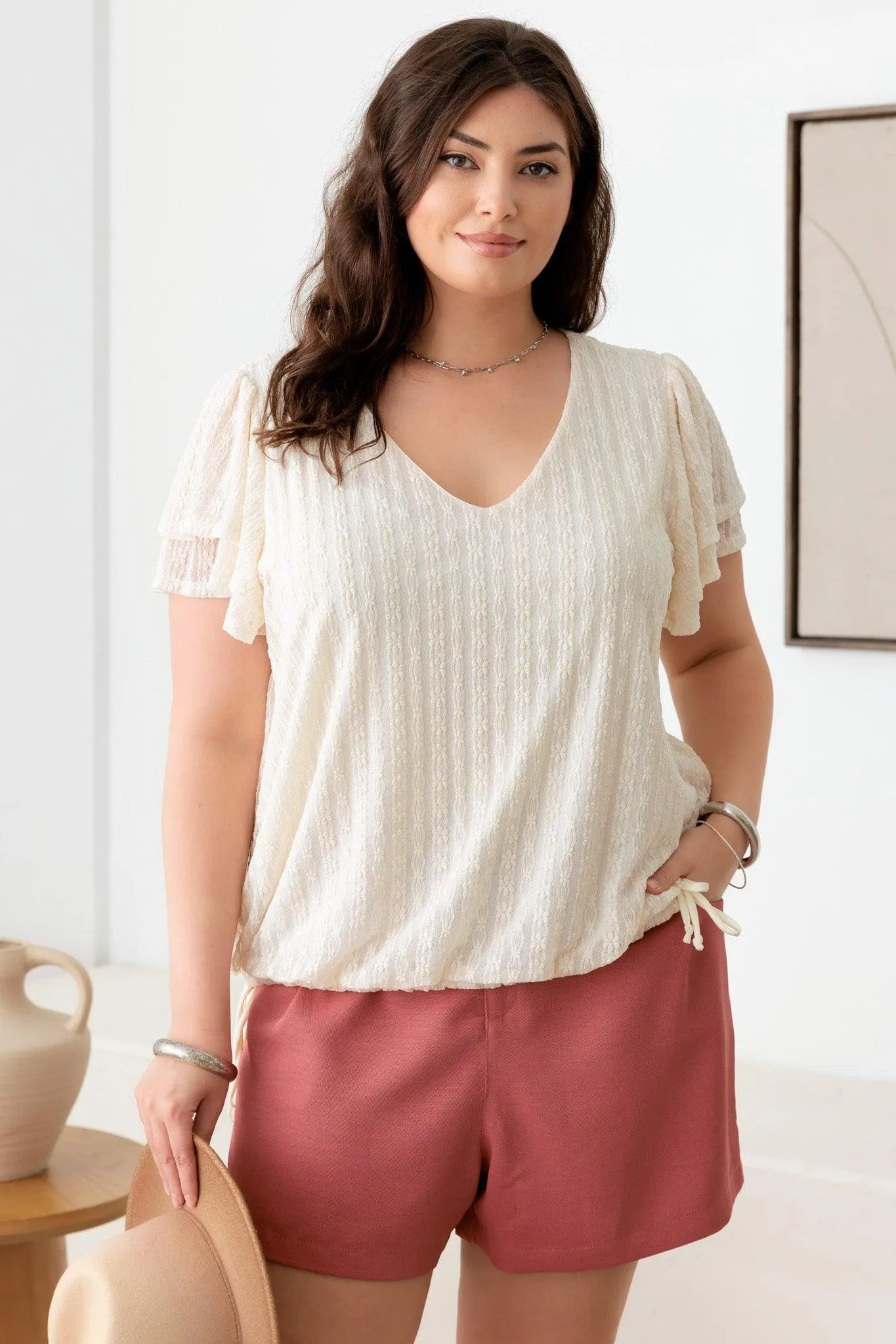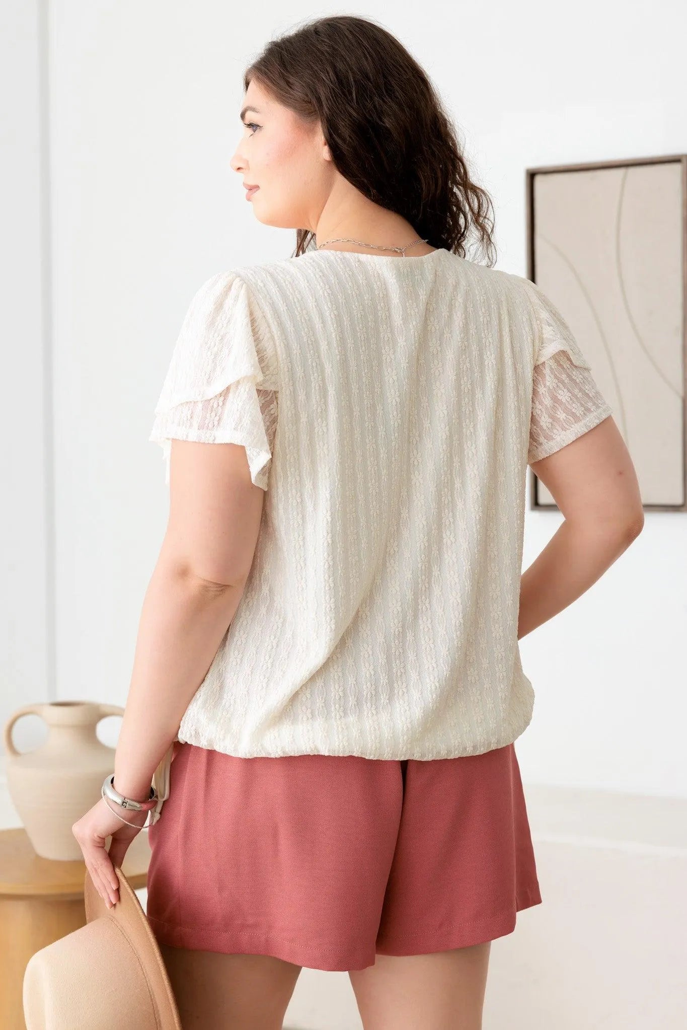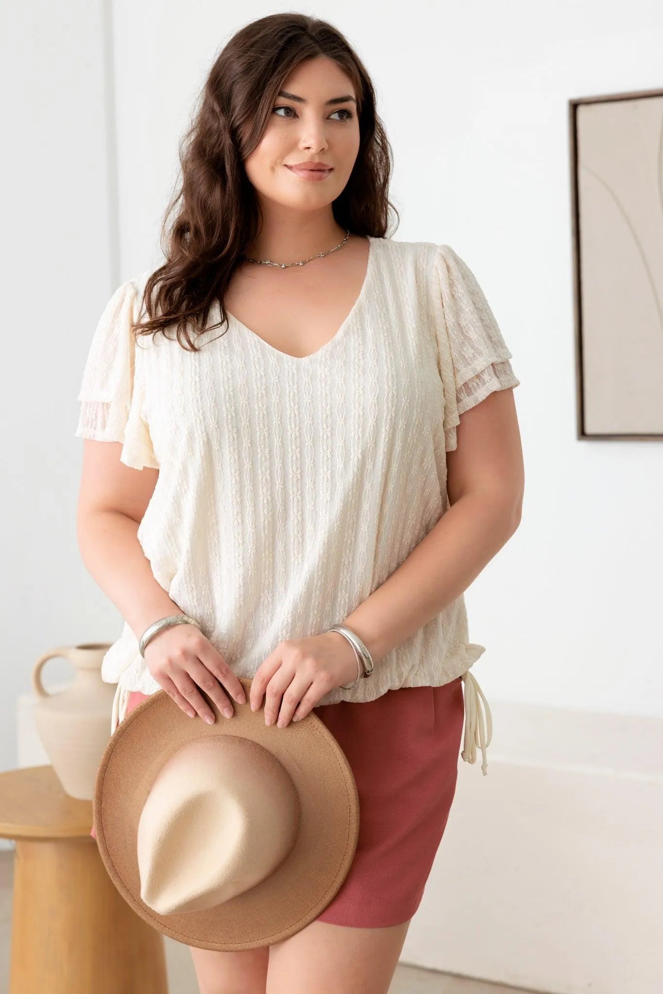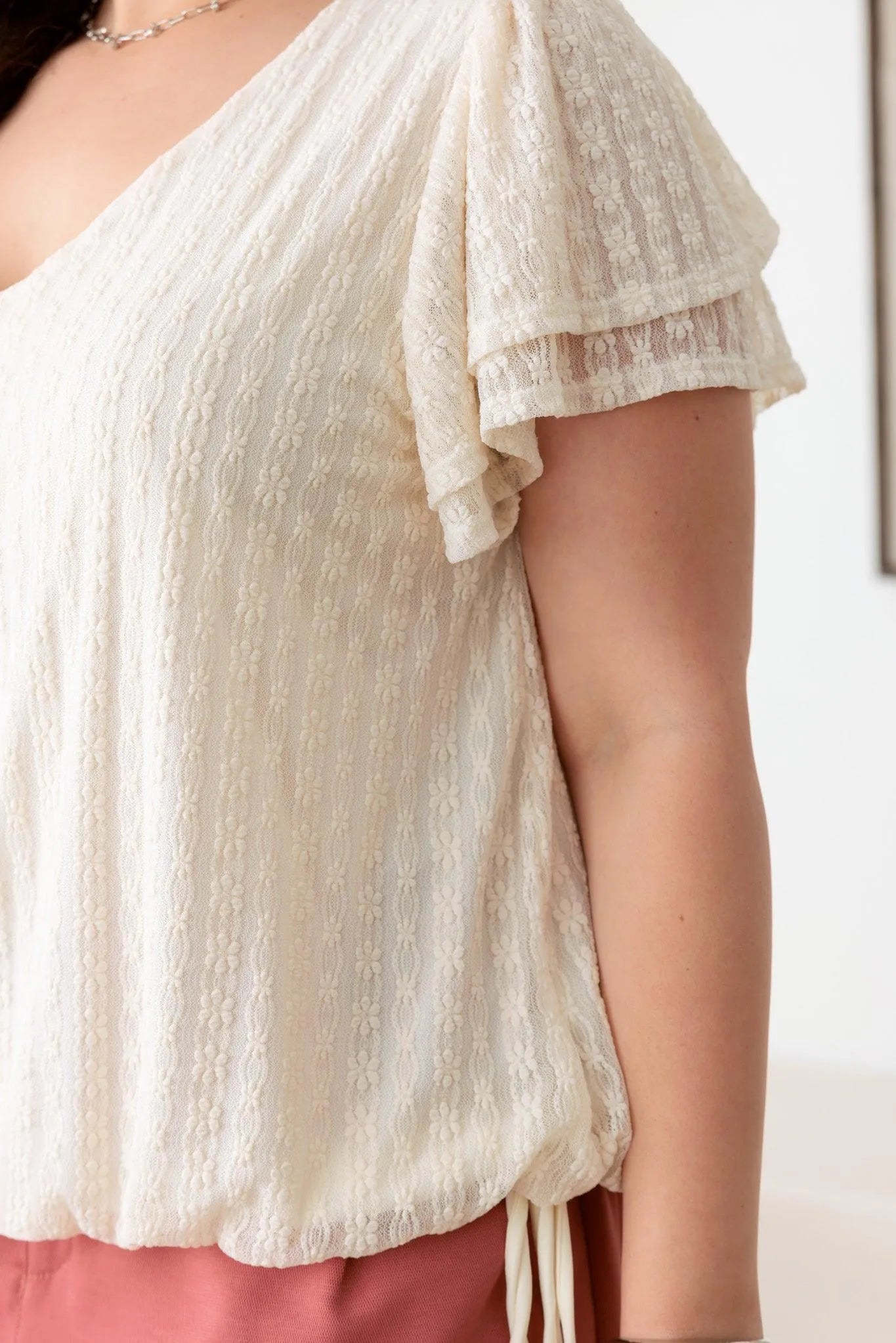 plus size top, solid color, lace pattern, short double layer sleeve, drawstring hem on the sides, boho, casual style, perfect romantic top!