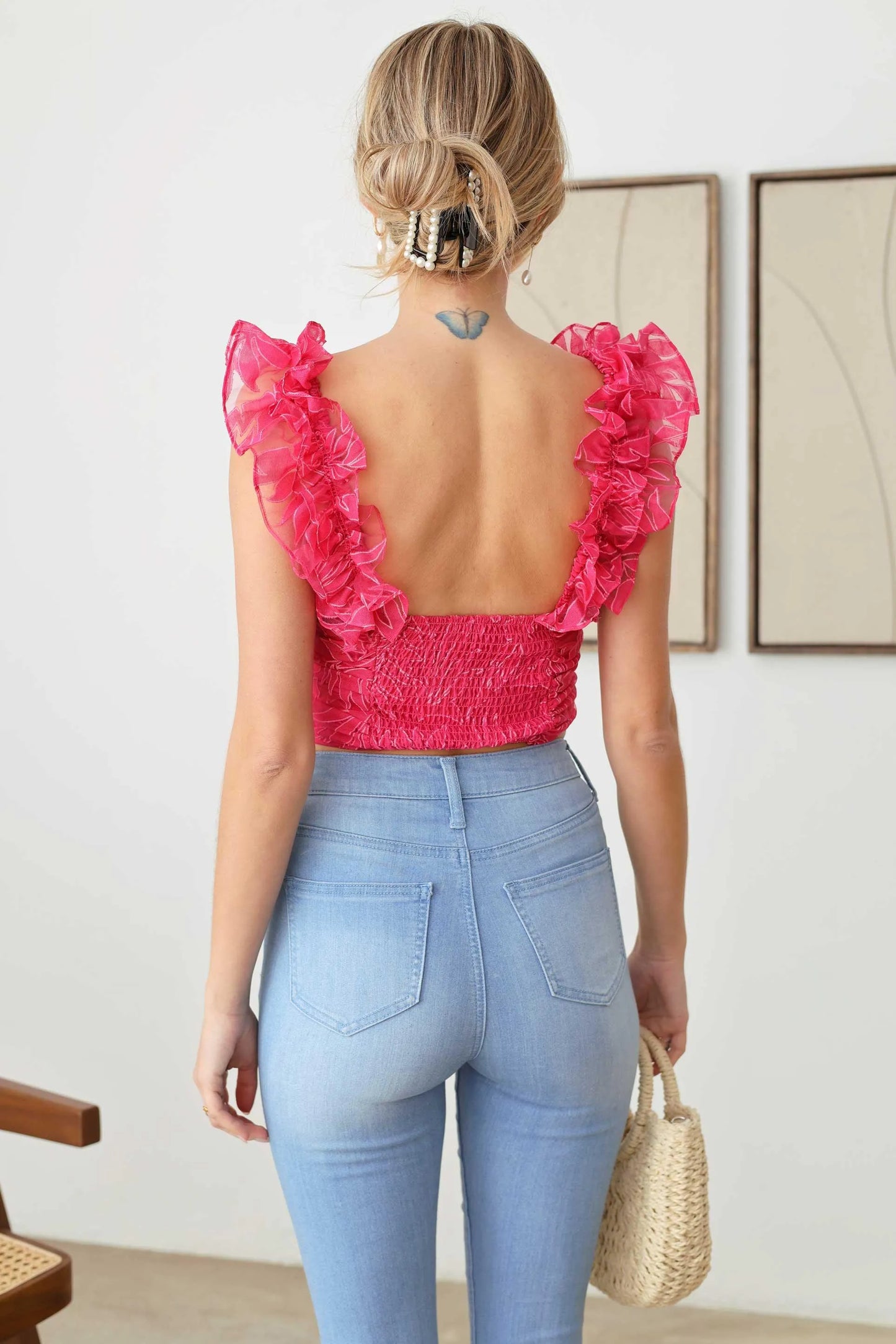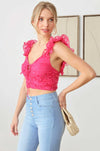 🖤 Introducing our Ruffle Sleeves Top! This organza sleeveless top features a playful and stylish floral print that will make you stand out. Crop it up and add a touch of fun to your wardrobe.