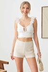 🖤 Item Feature: organza, floral print, crop, sleeveless, ruffle sleeve, v-neck, front tie, side zipper, smocked back, valentine, love, party, cute.
