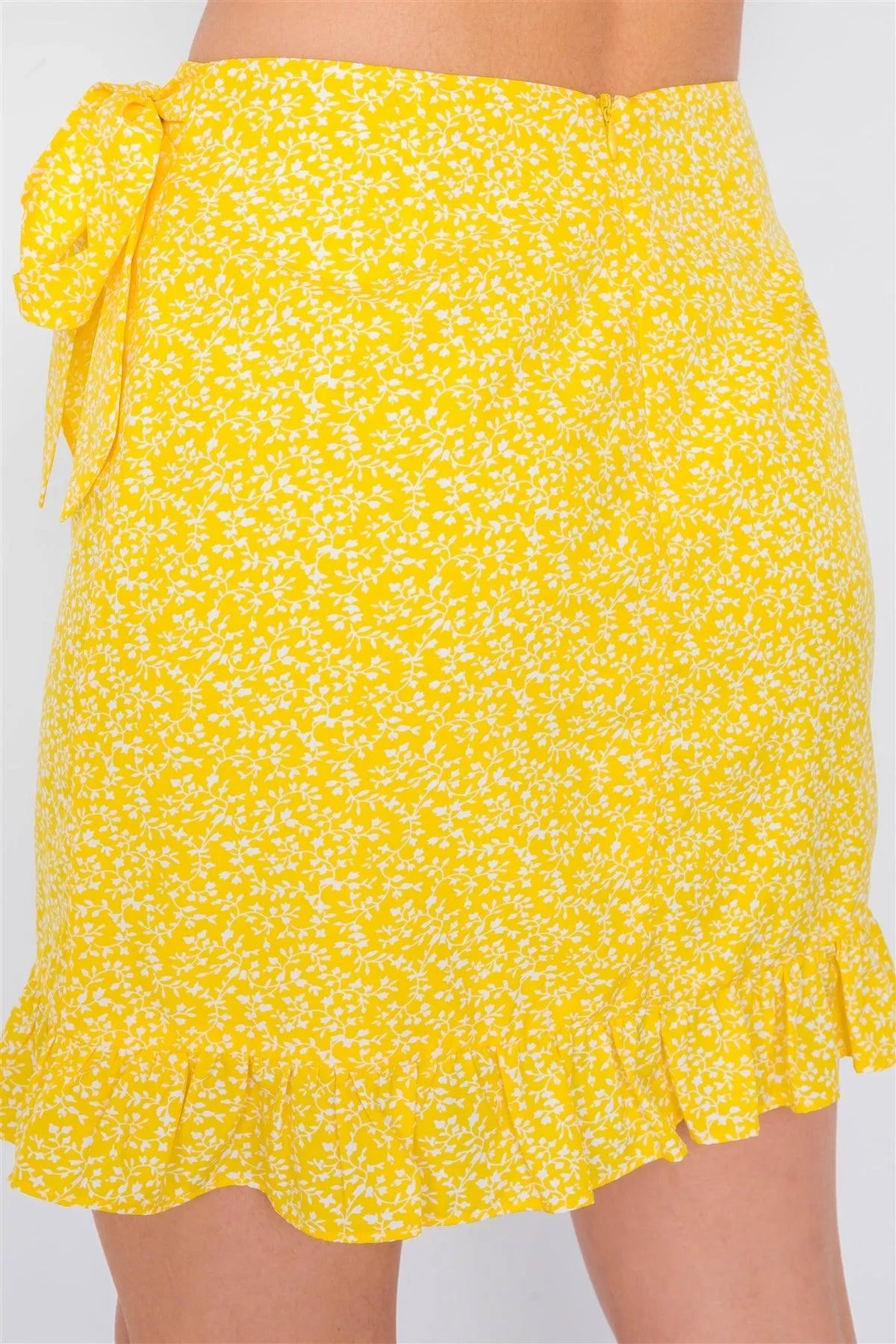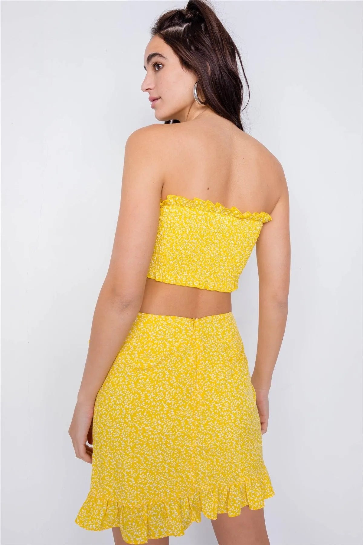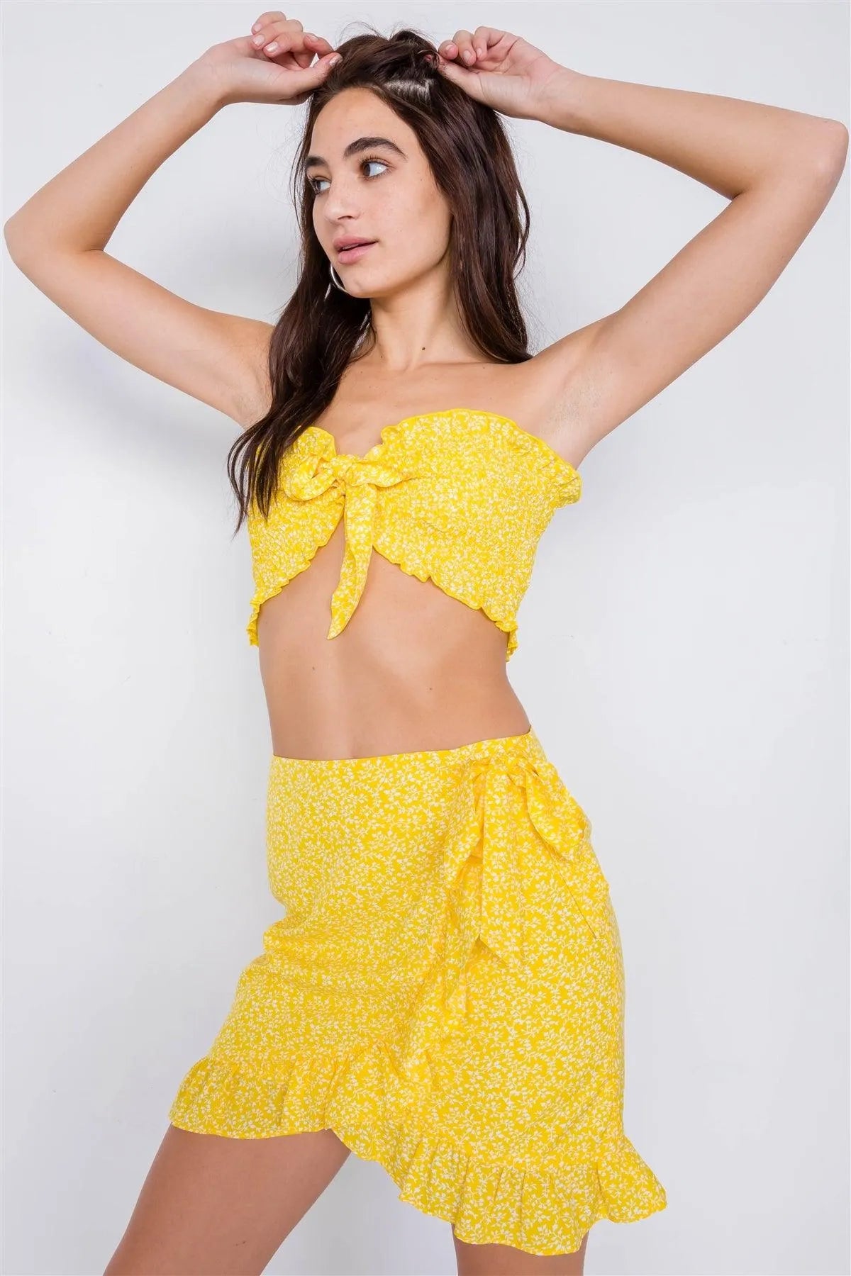 Yellow Boho White Floral Print Bandeau Mini Wrap Skirt Set /4-2-1