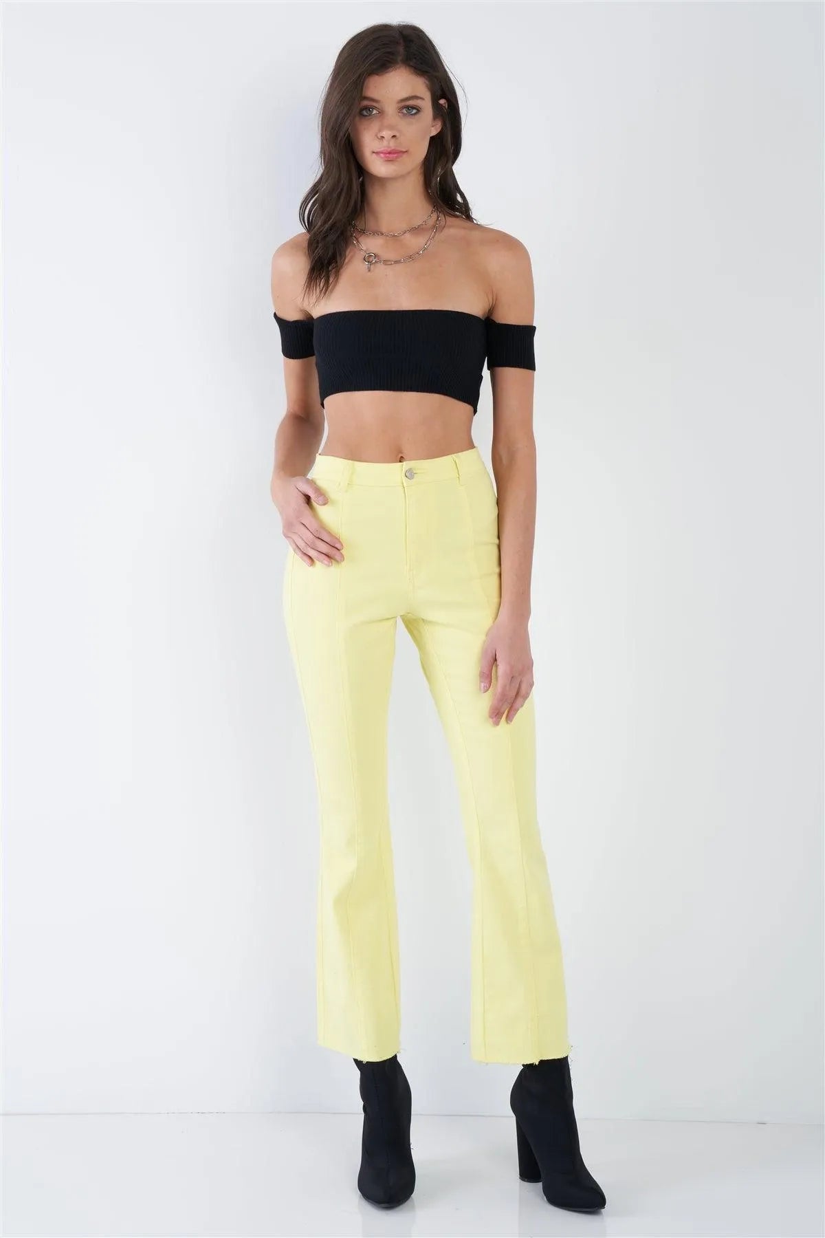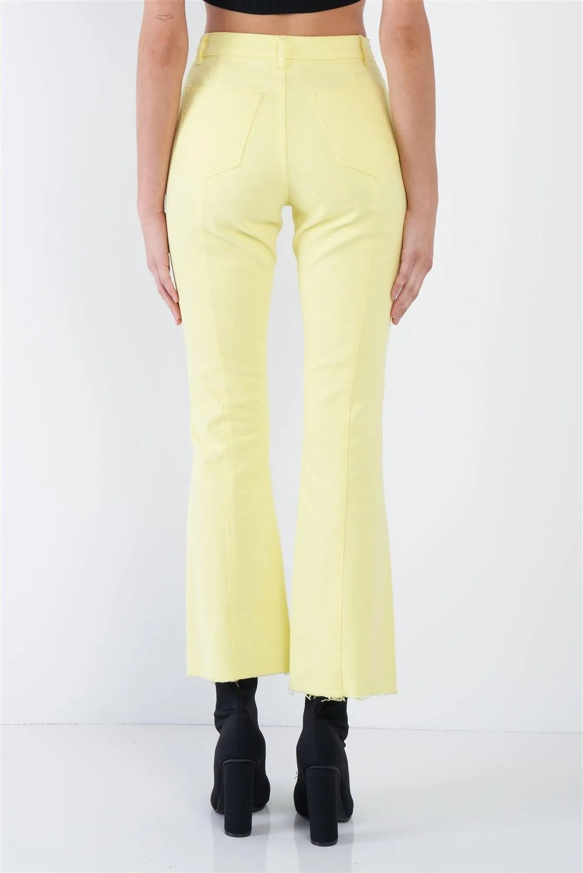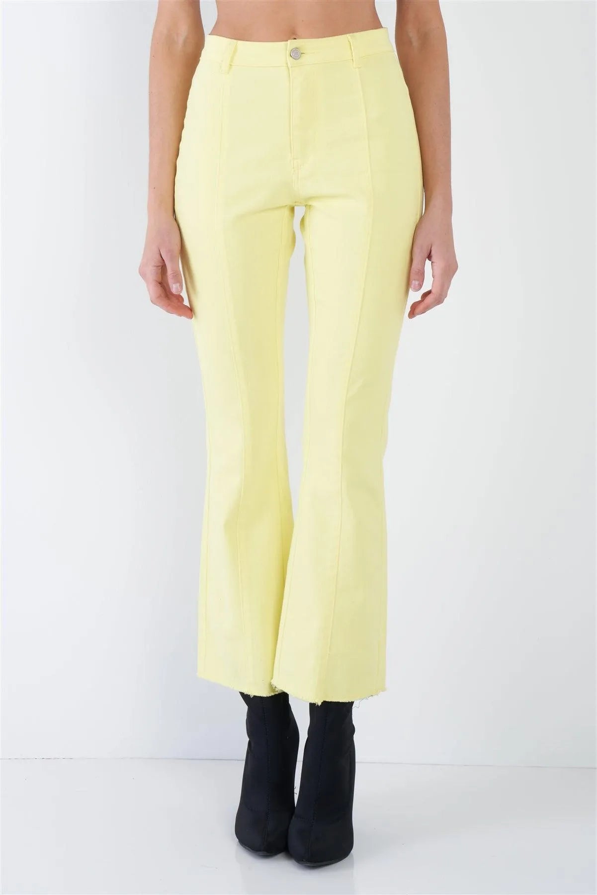 Pant Features: solid, neon yellow, front pleat, belt loop, two back pockets, front zipper and button closure, causal, chic, raw hem, boot cut, unlined, stretchy.Model is 5'9 wearing a size Small ( Waist: 23.5", Bust: 32B, Hips: 36")Item Measurements: Length: 39" , Waist: 26"Item comes pre-packed with hang tagsTrue to size