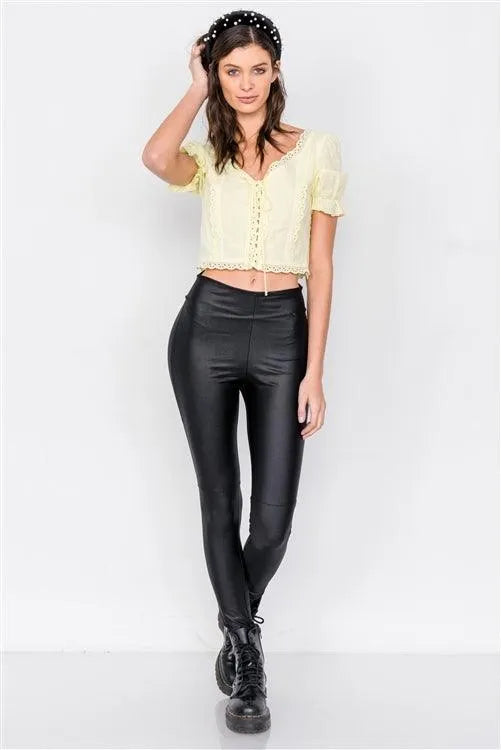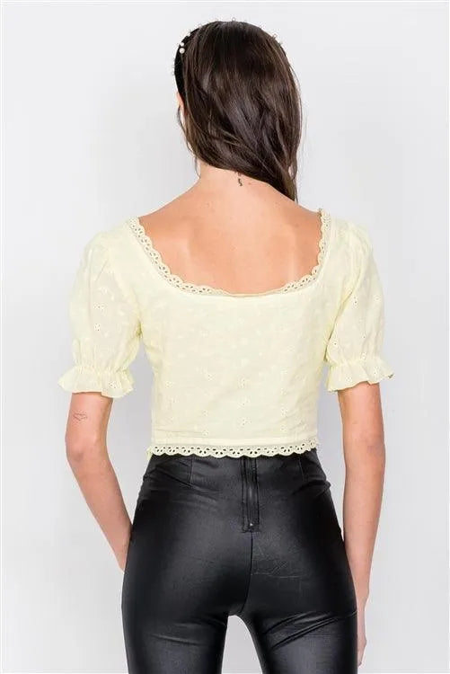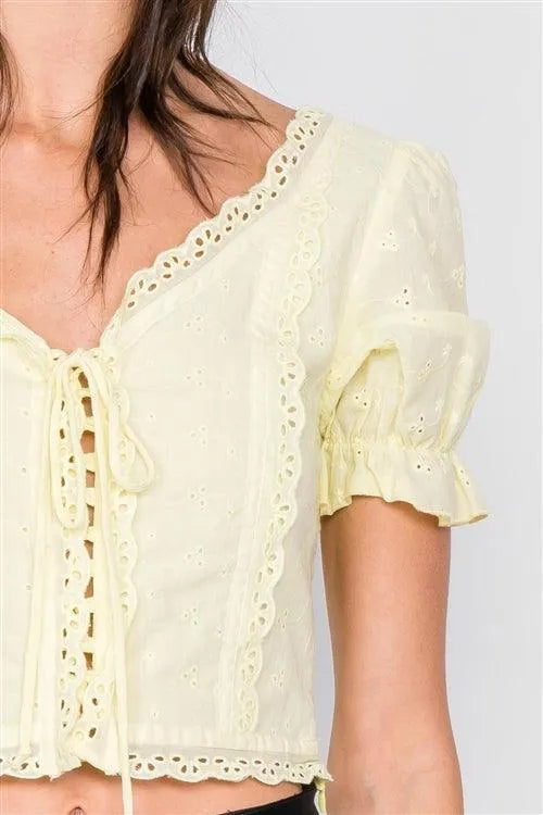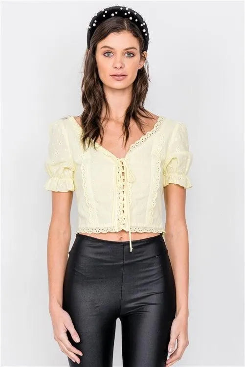 Yellow Eyelet V-Neck Lace Up Puff Sleeve Boho Crop Top /2-1-1