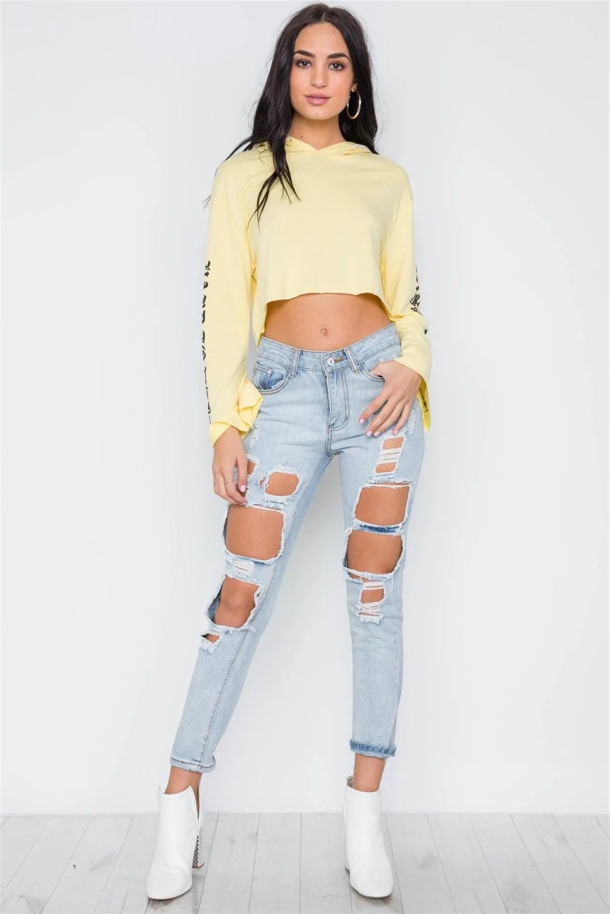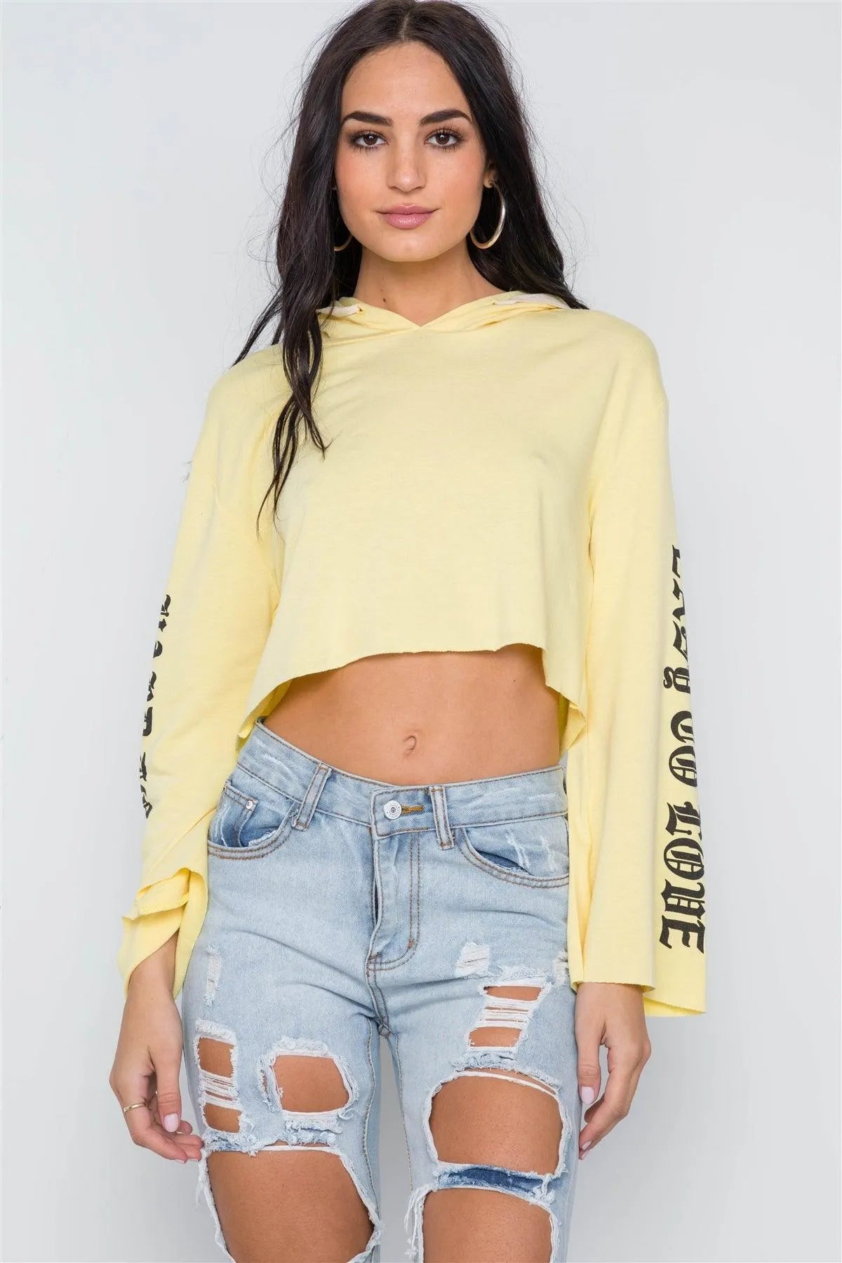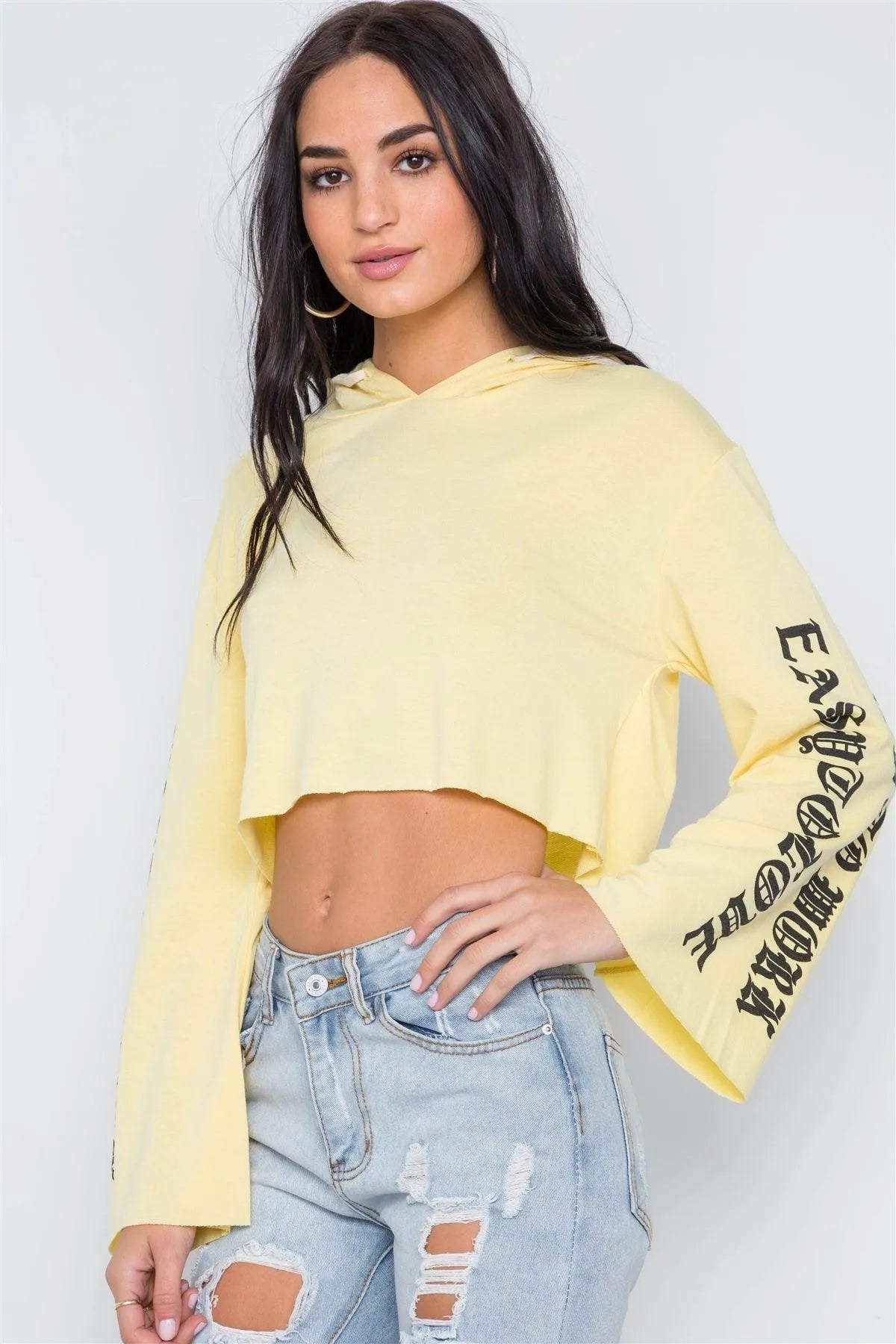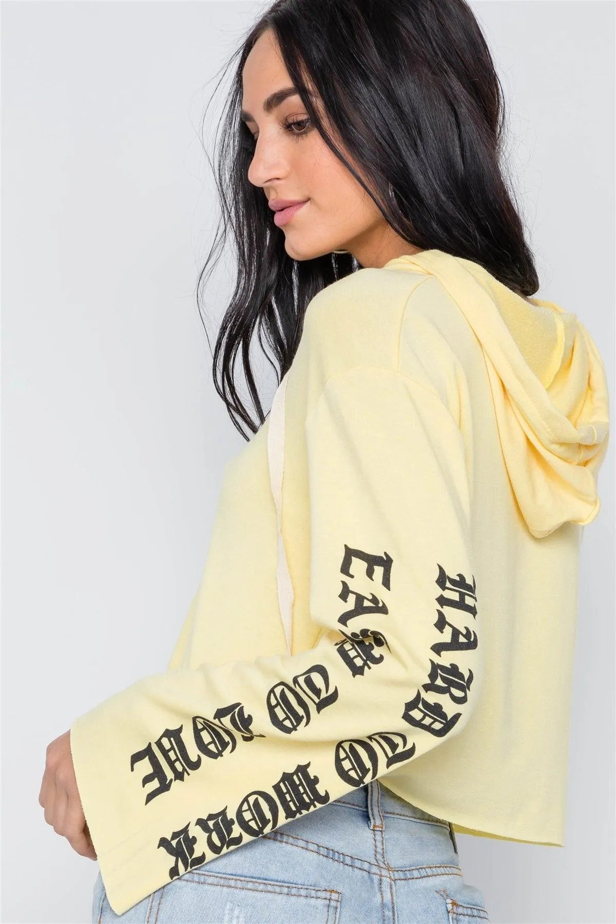 Yellow Graphic Print Long Sleeves Hooded Crop Top /2-2-2