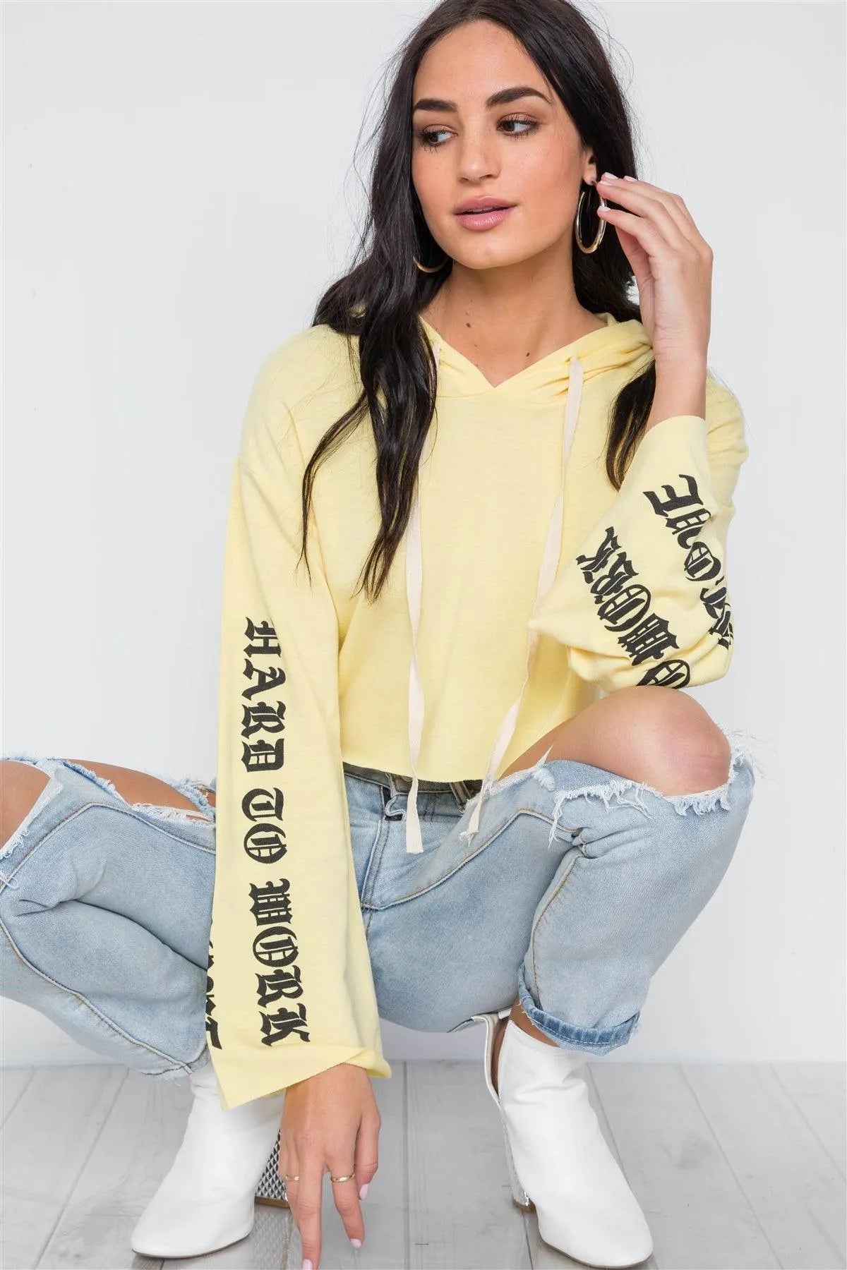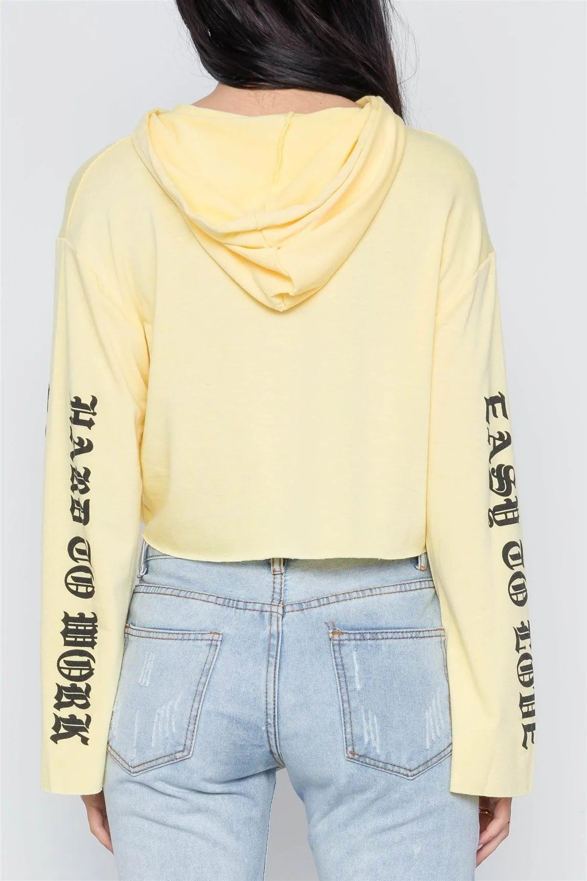 Top features: long sleeves, hooded, raw at hem and cuffs, graphic print at both sleeves: "HARD TO WORK", 'EASY TO LOVE", crop length, unlinedModel is 5'8 and wearing Small (Waist: 24", Bust: 32A, Hips: 34")Item Measurements: Length: 17", Bust: 36" Sleeves: 21"True to sizeAvailable in Lavender and Mauve