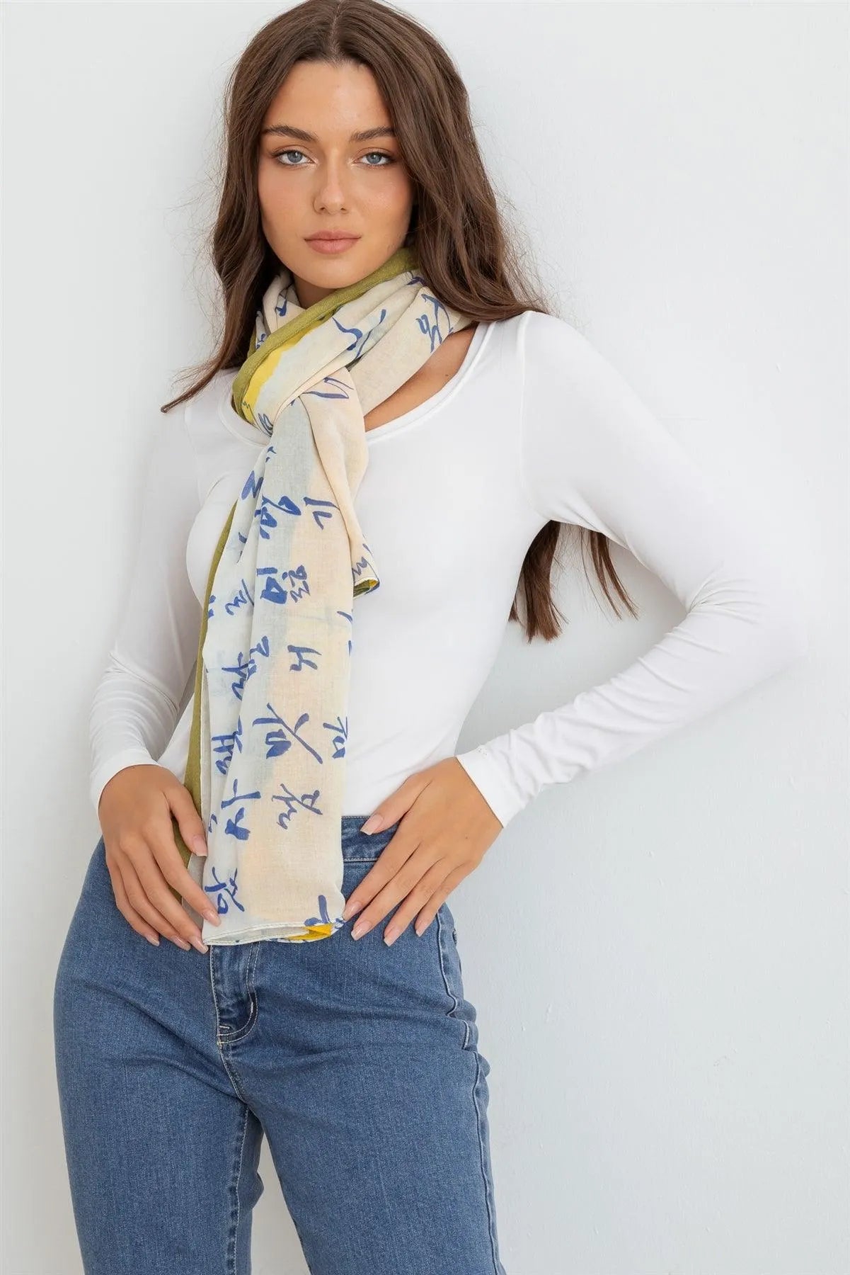🖤 Item Features: Yellow, hangul korean languages print shawl scarf, non-stretchy, see through, unlined, stylish, cool, must-have, trendy, lifestyle.