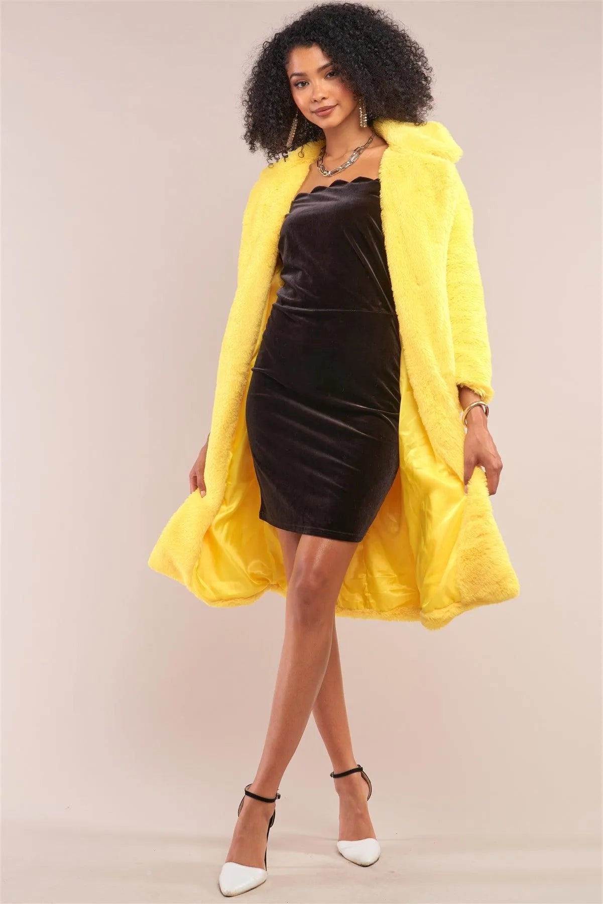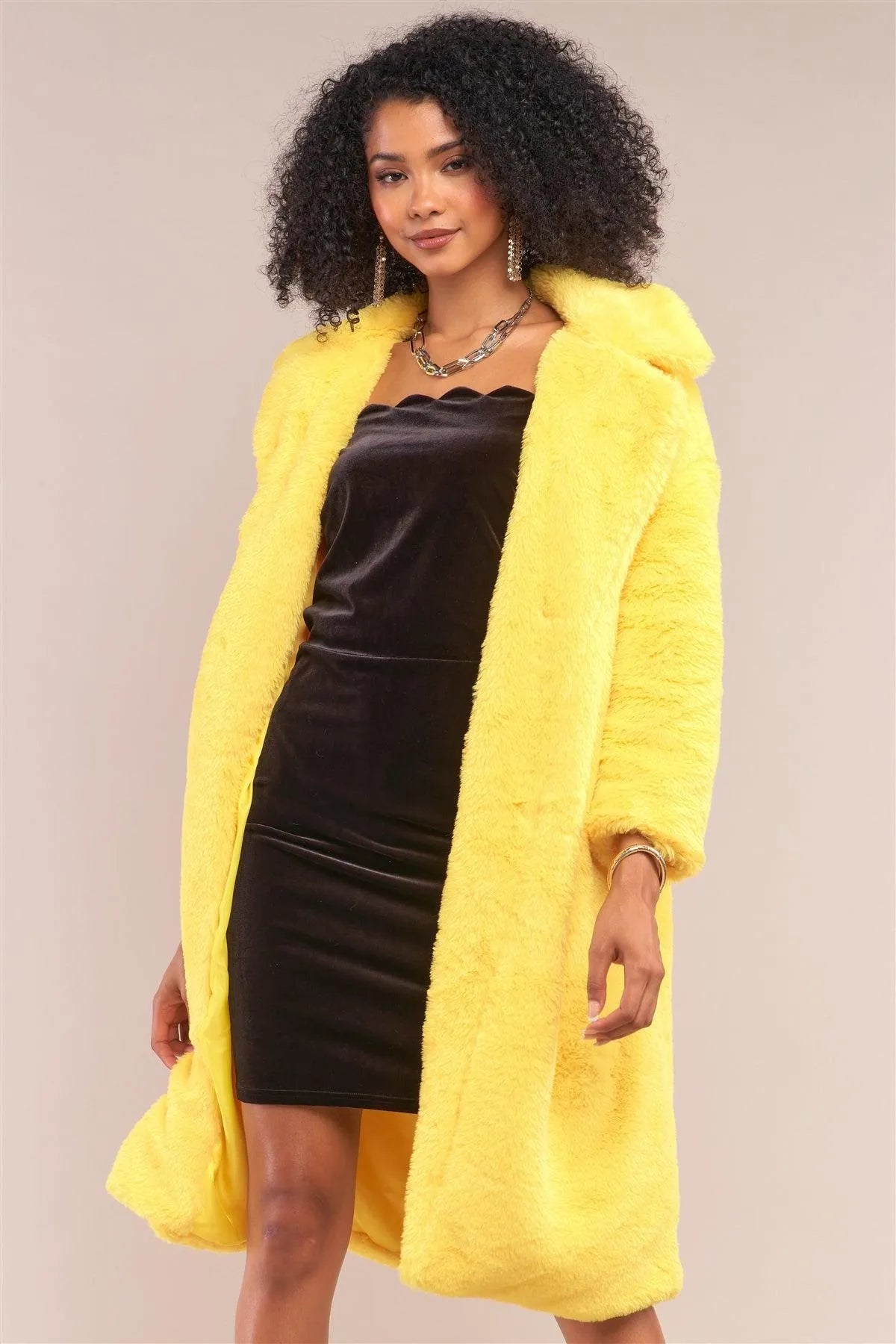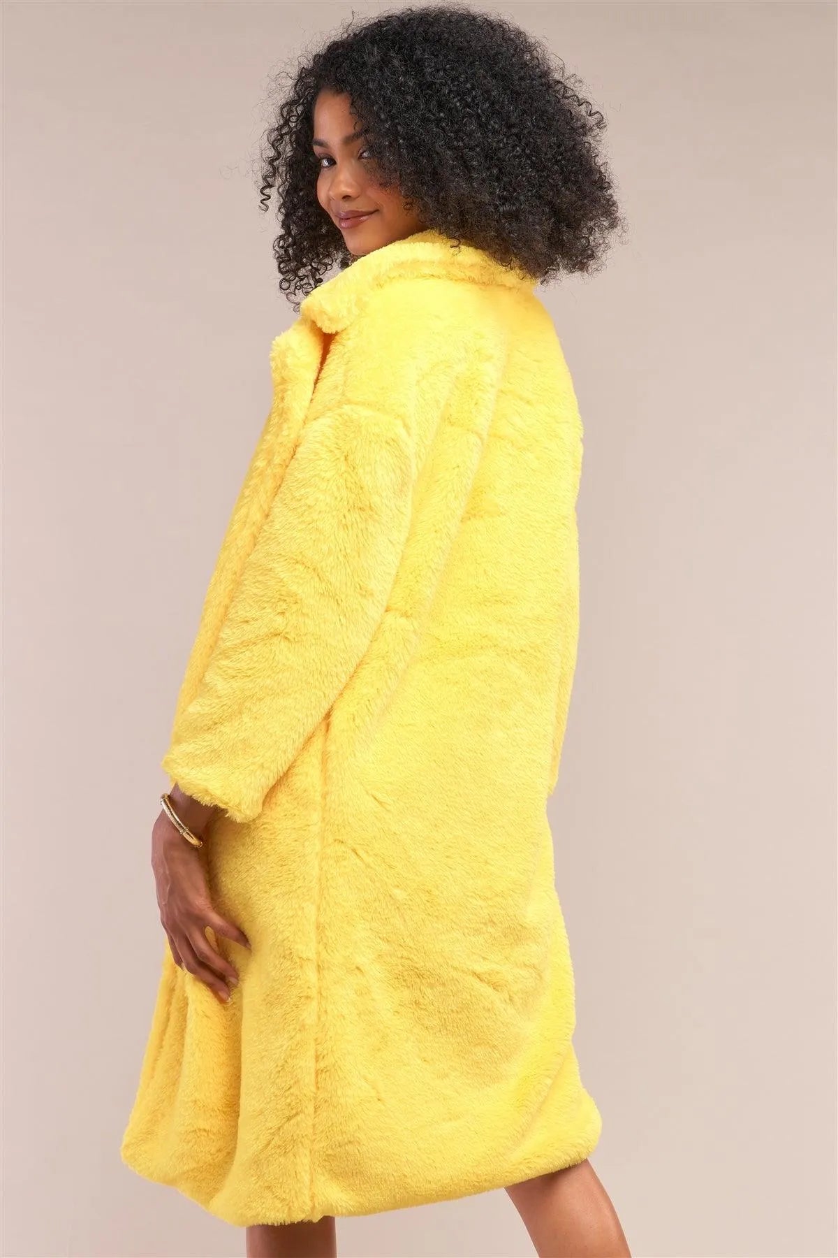 Yellow Long Sleeve Open Front Faux Fur Trench Coat /1-1-2
