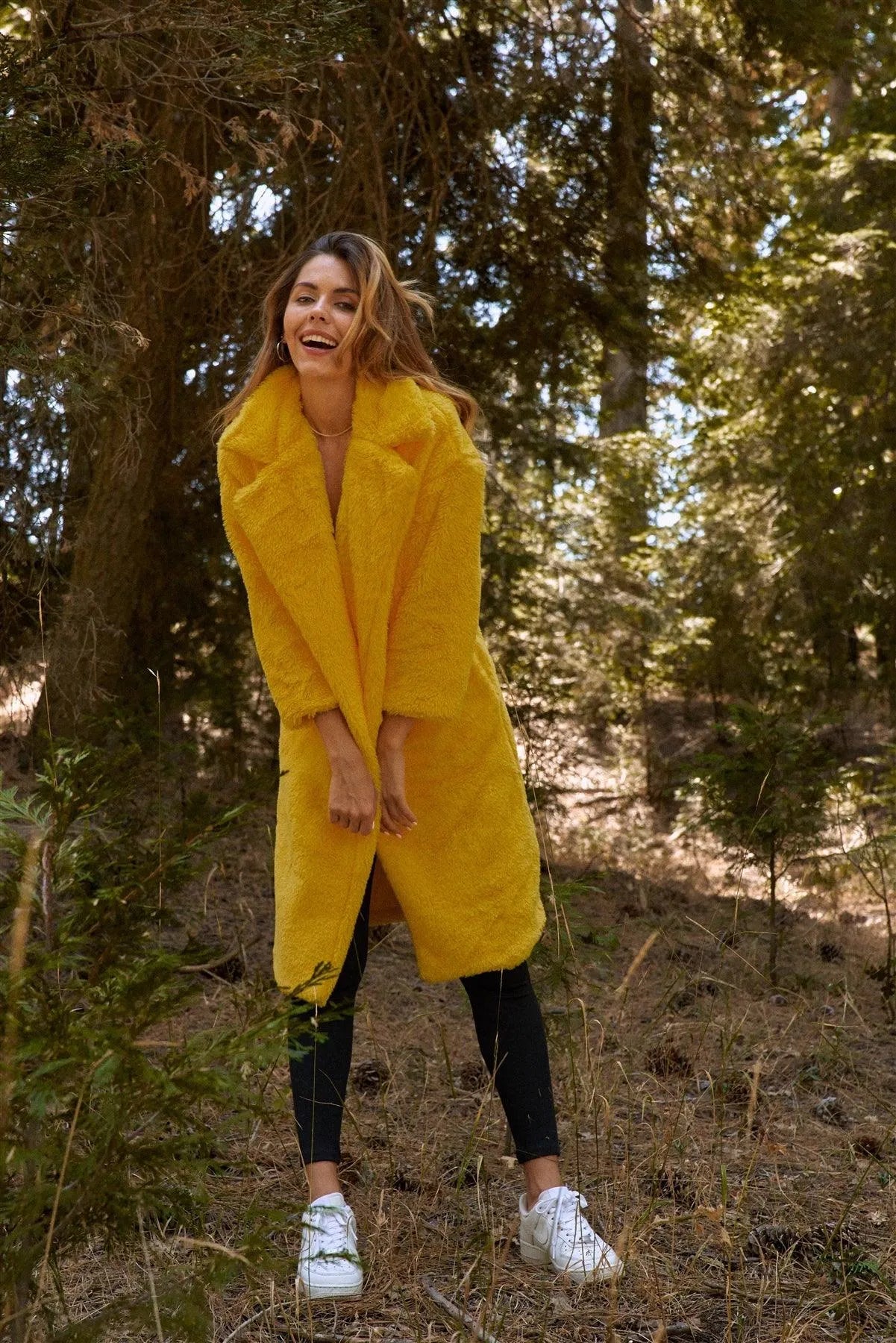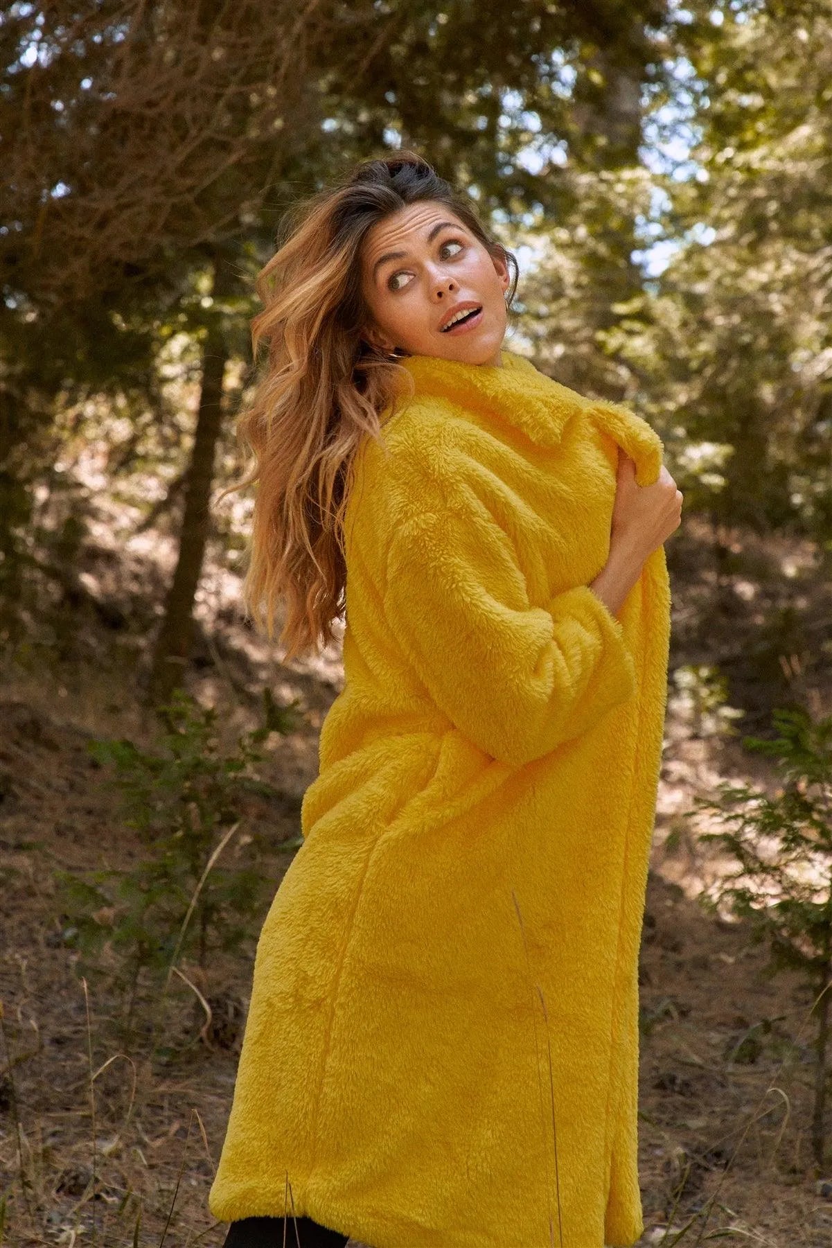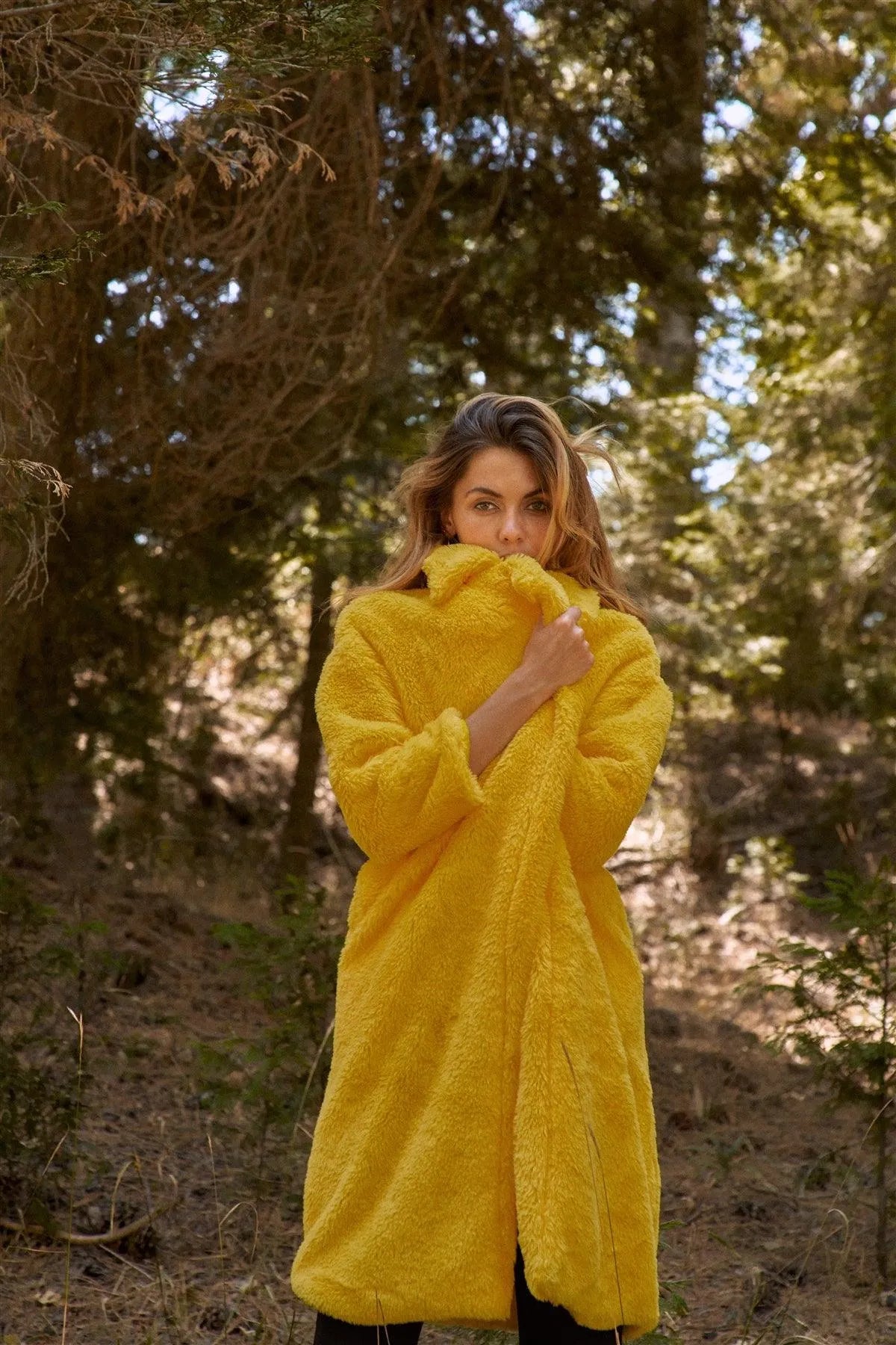 🖤 Item Features: Solid yellow, teddy bear faux fur, long sleeve, open front, collared, relaxed fit, midi length, non-stretch, inner satin lining, casual, luxurious style, comfy, cozy, new fall/winter collection