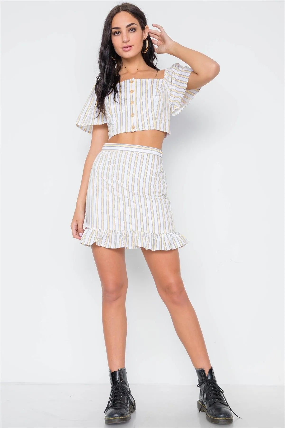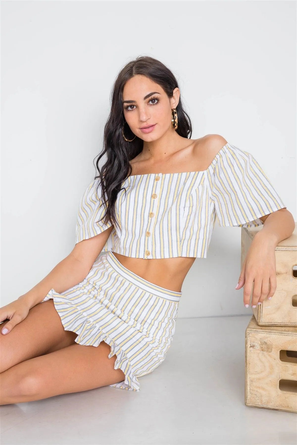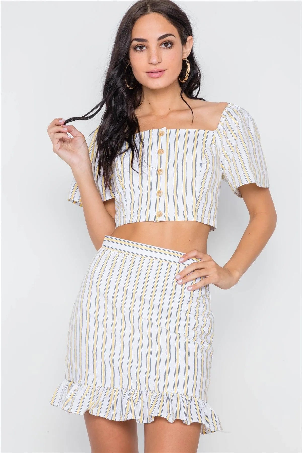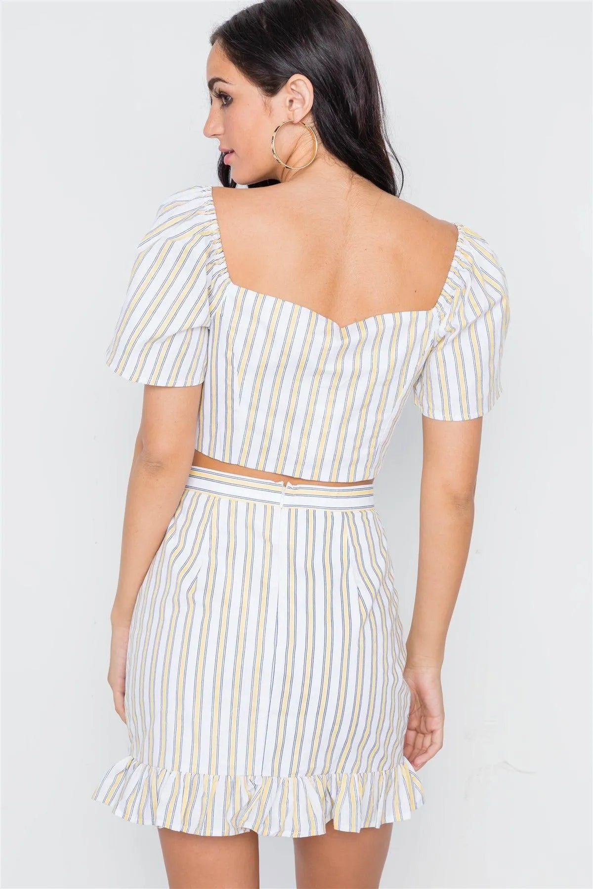 Yellow Navy Stripe Two Piece Crop Top Ruffle Skirt Set /3-2-1