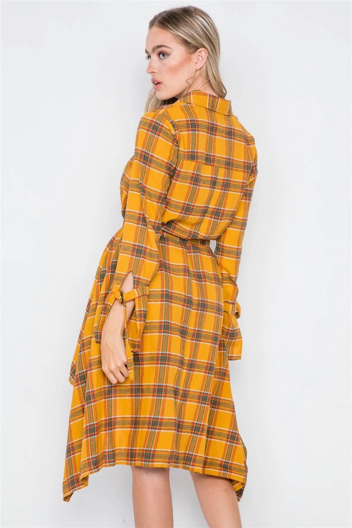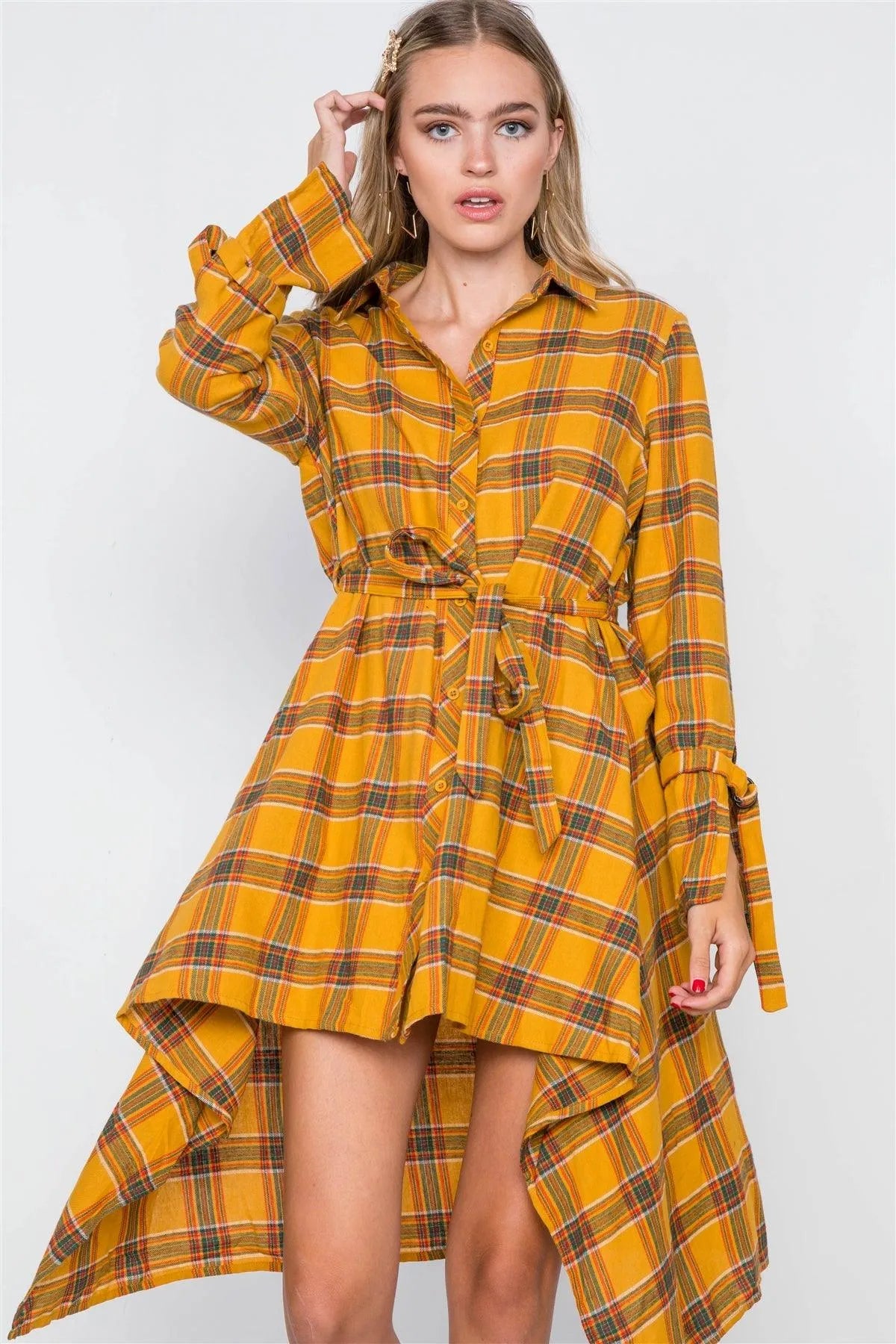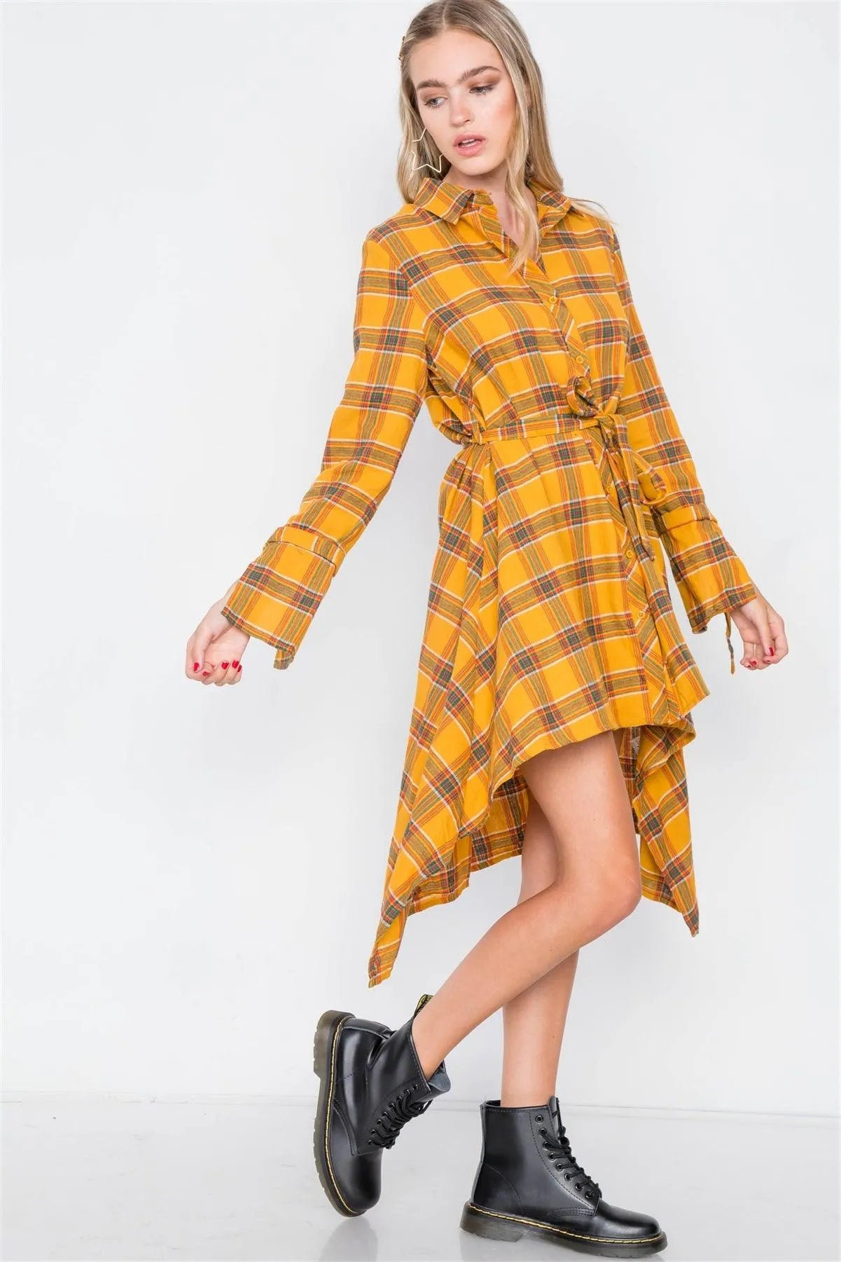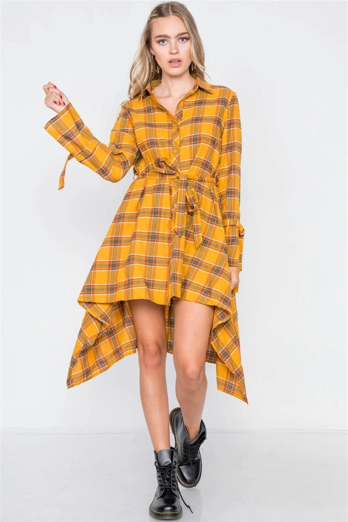 Yellow Plaid High Low Button Front Shirt Dress / 2-2-2