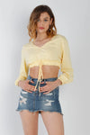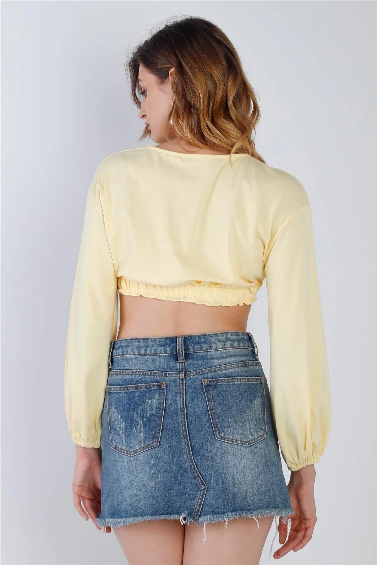 Yellow Self-Tie Ruffle Hem V-Neck Long Balloon Sleeve Crop Top /2-2-2