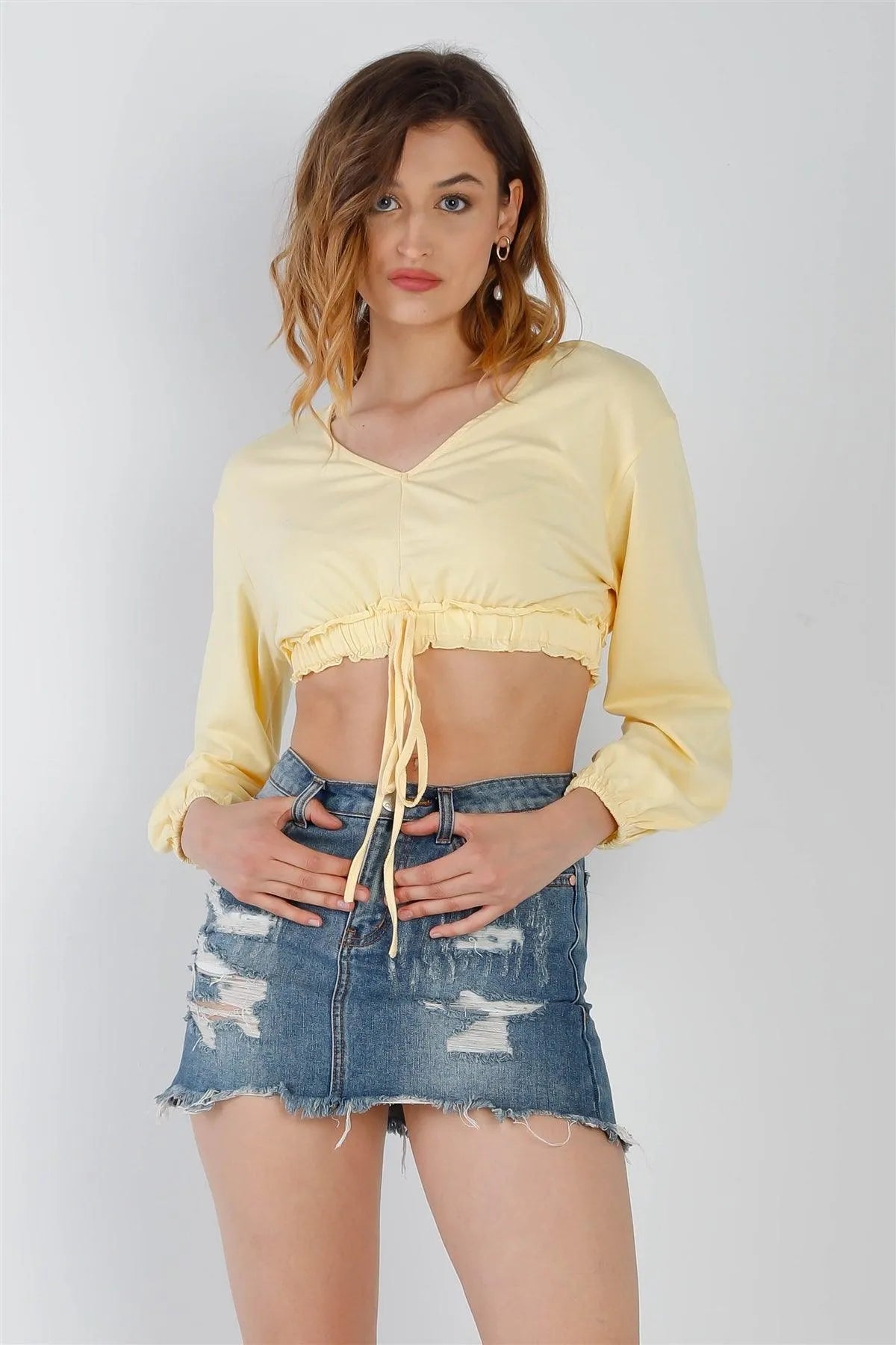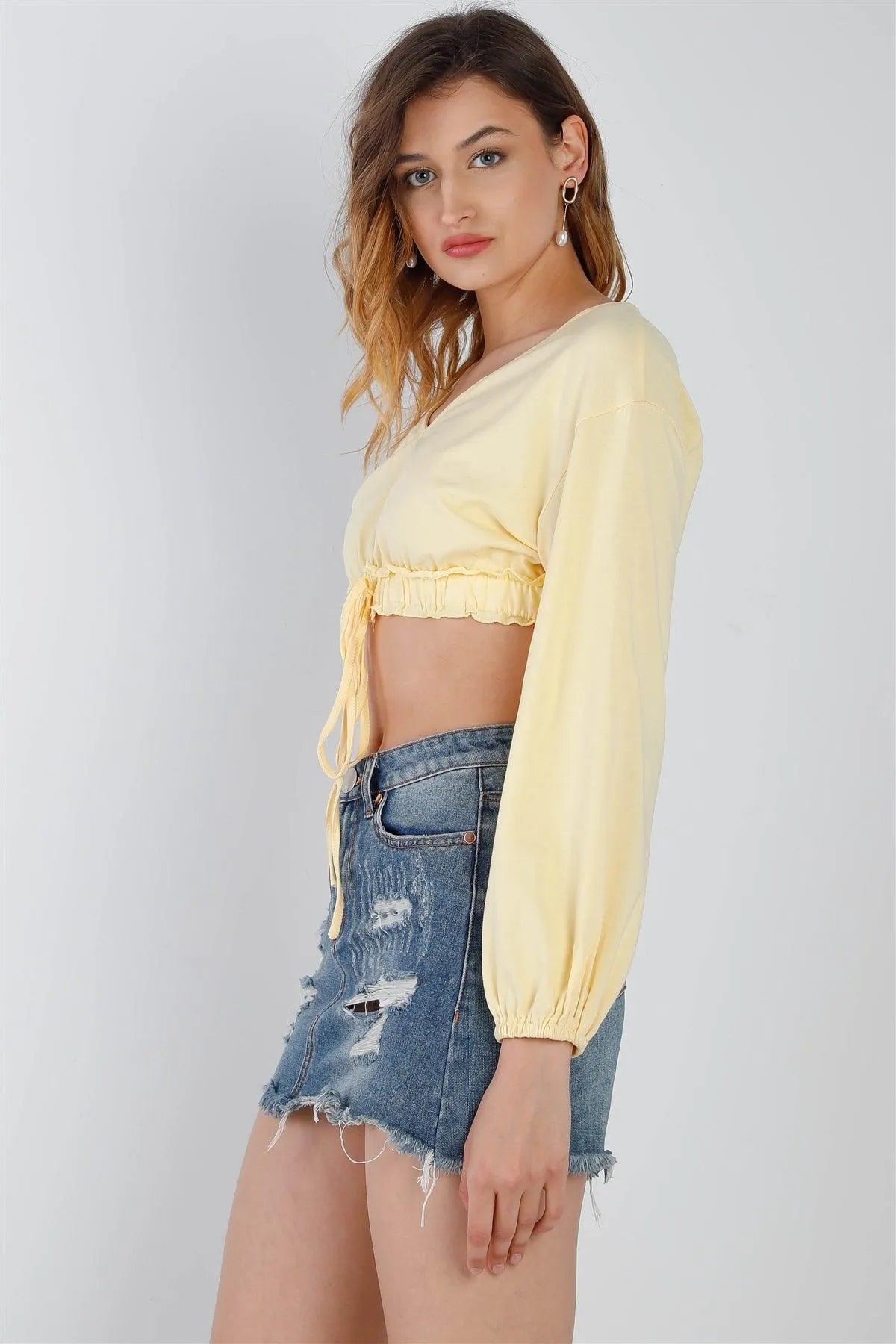 🖤 Item Features: Yellow, cotton blend, solid color, v-neckline, self-tie detail ruffle elasticized hem, long puff balloon sleeve with elasticized cuffs, cropped length, casual, cute, girlish, trendy, stylish, boho