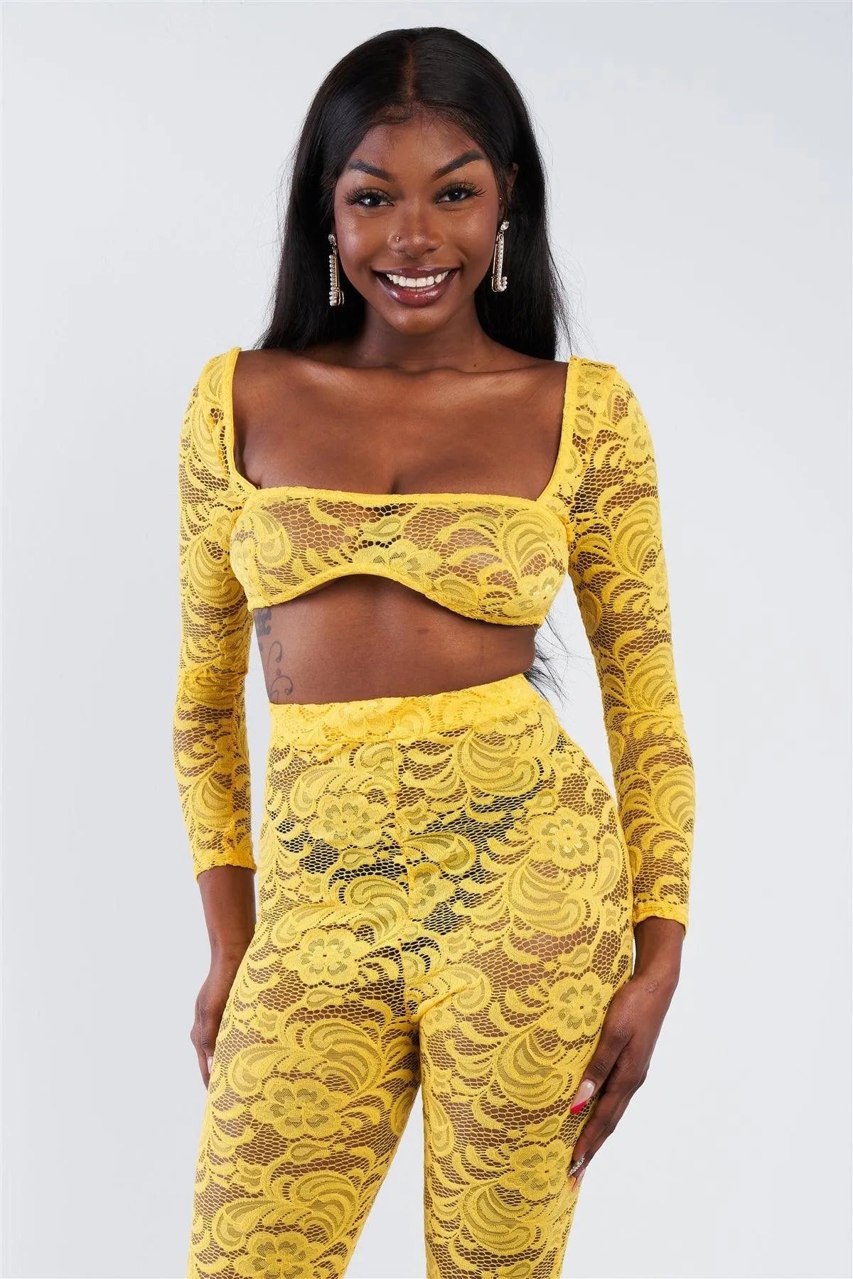 Yellow Sheer Floral Lace Crop Square Neck Top & High Waist Flare Pant Set /2-2
