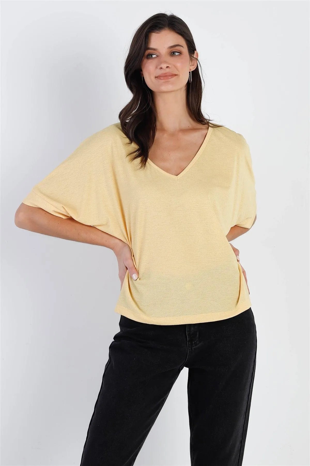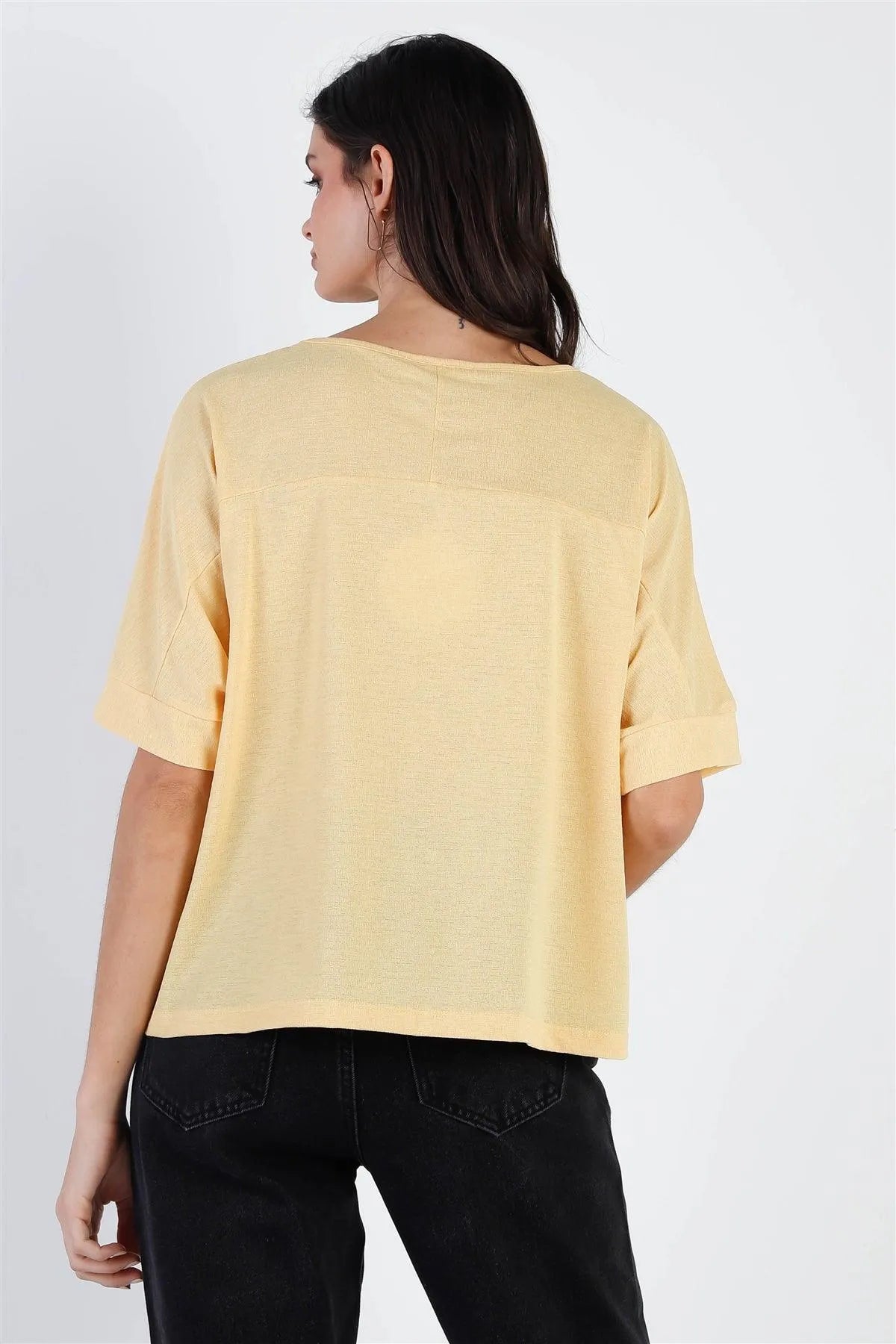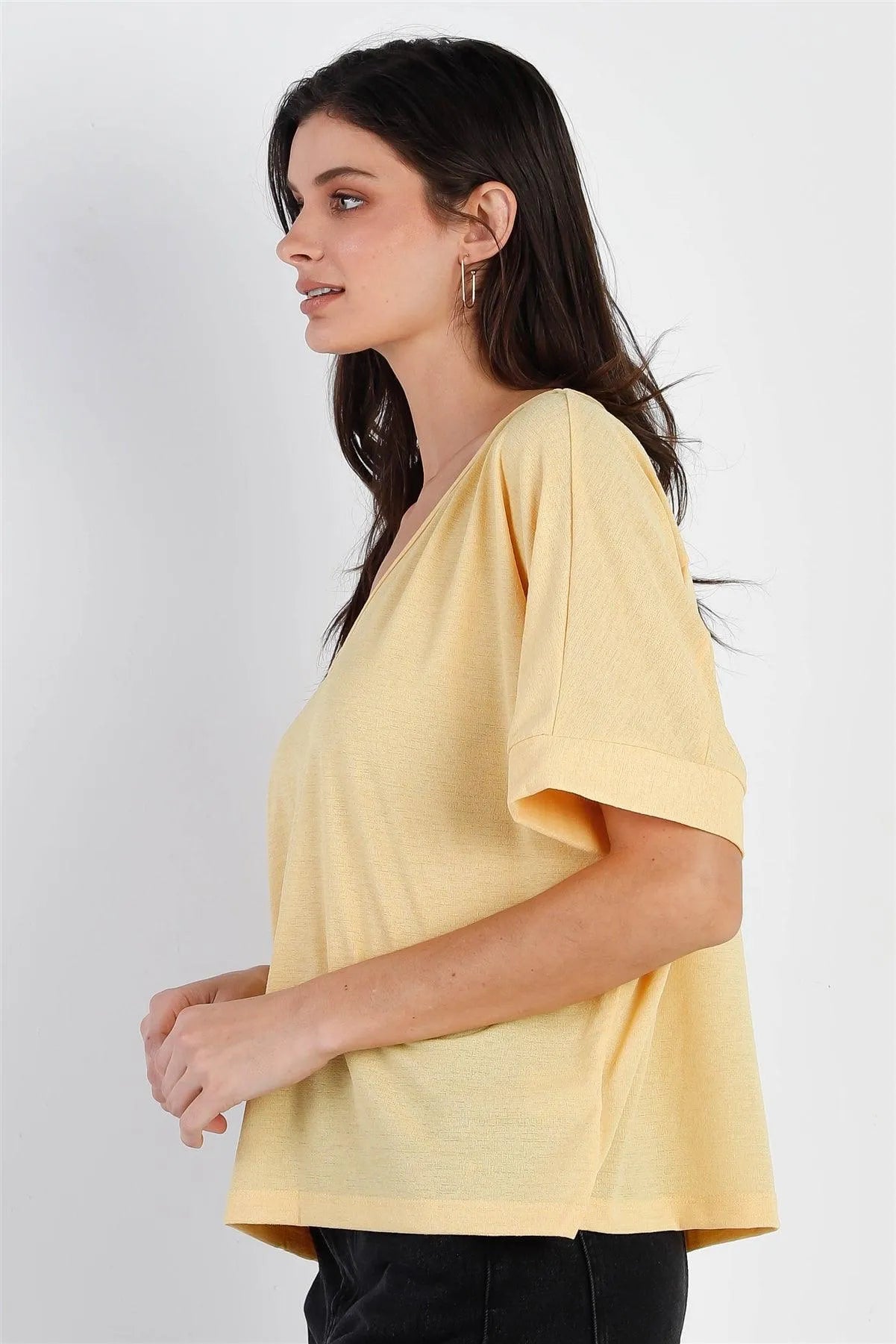 Yellow Textured V-Neck Relaxed Short Sleeve Top /3-2-1