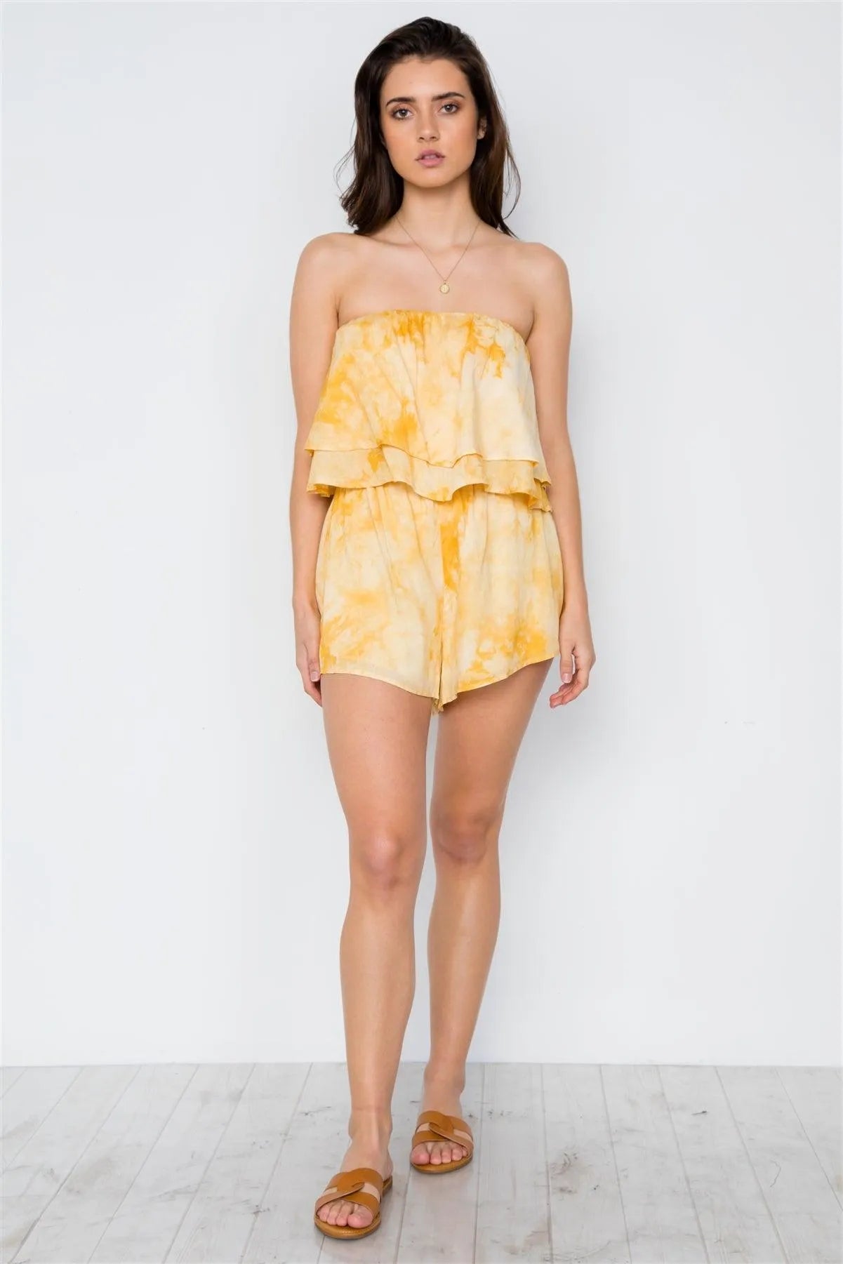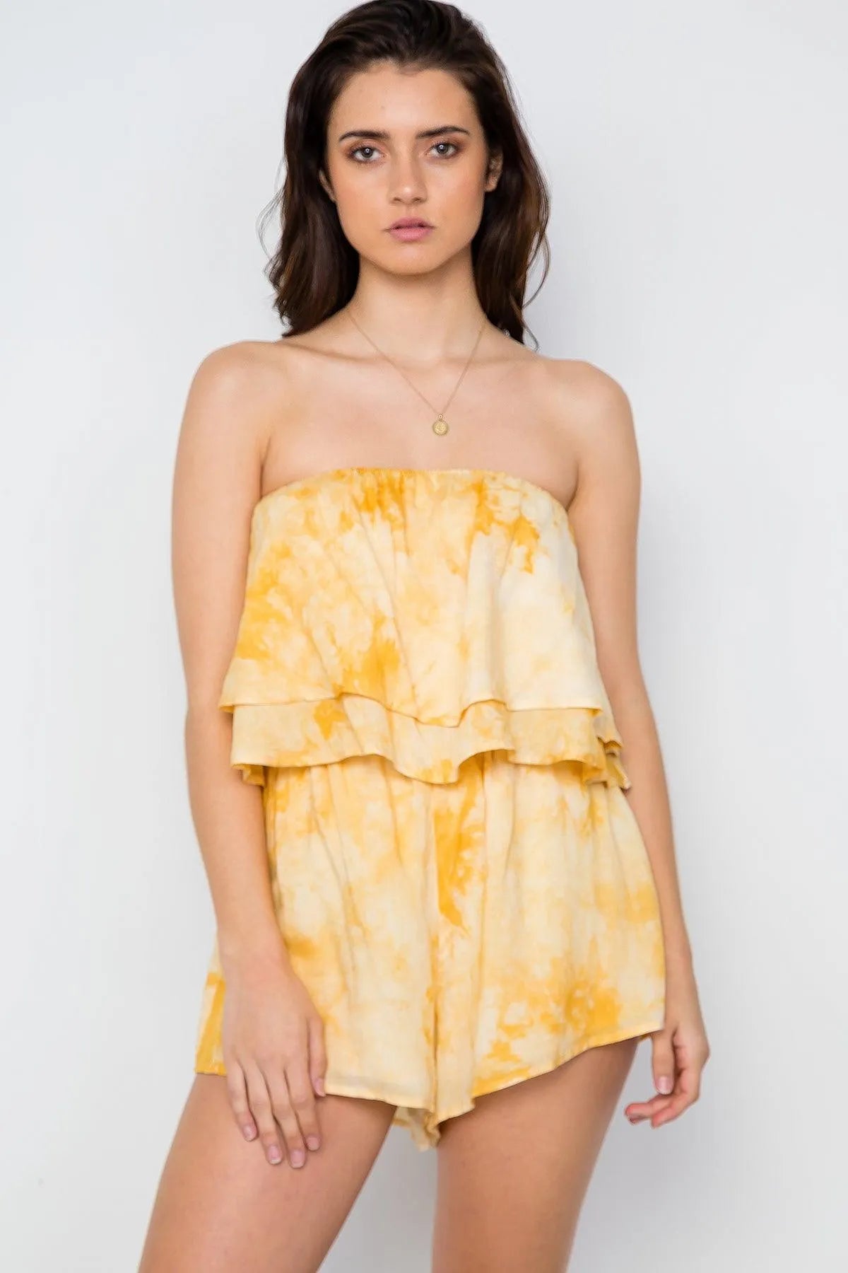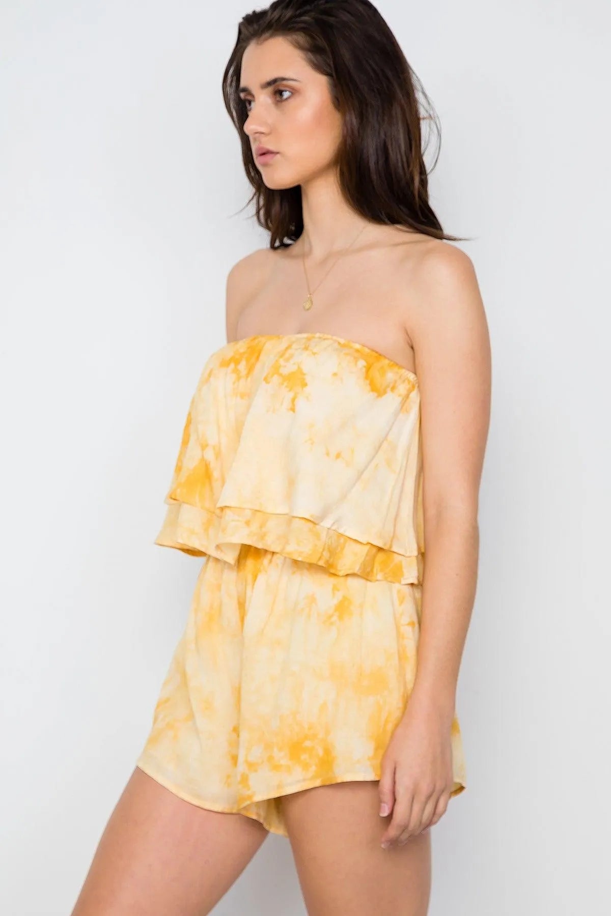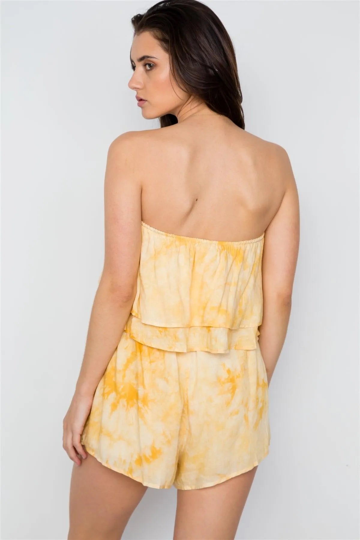 Yellow Tie Dye Strapless Boho Flounce Romper / 1-2-2-1