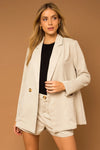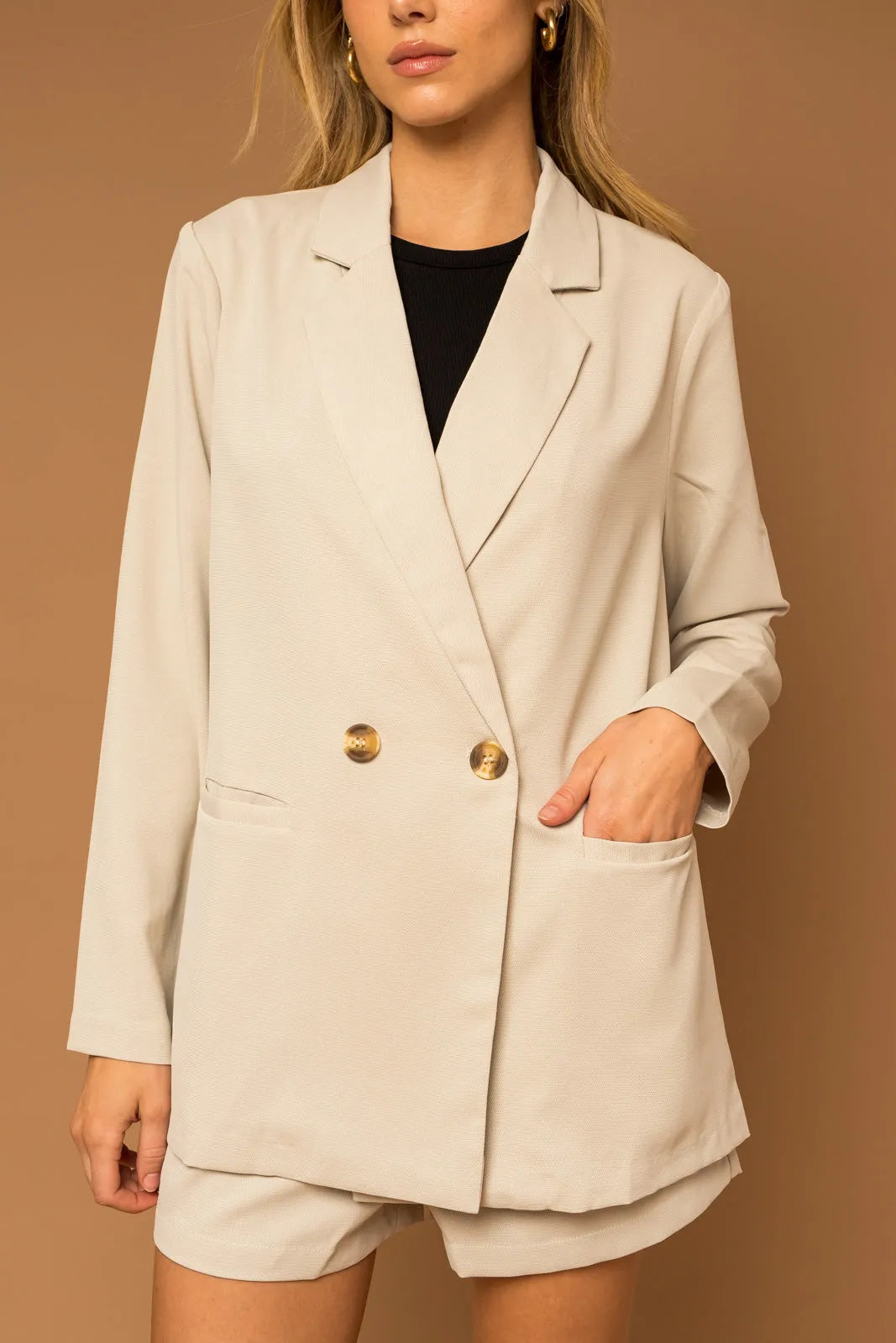Elevate your boutique's wholesale clothing collection with our trendy blazer set that screams boss babe energy! This oversized blazer and matching shorts combo features luxurious styling with gold-tone buttons and a perfectly relaxed fit that your customers will adore. Perfect for the fashion-forward entrepreneur who means business but keeps it stylishly casual.