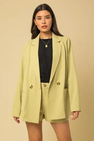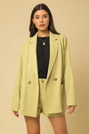 🖤 Features: Premium lightweight fabric, oversized relaxed fit, double-breasted design, gold-tone buttons, functional pockets, matching high-waisted shorts, fully lined, available in cream and sage green