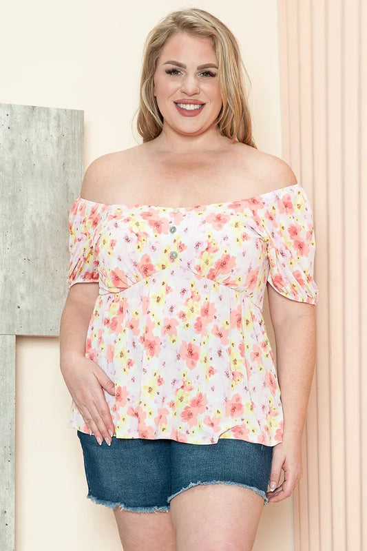 Plus size top: polka dot pattern, short sleeve, pearl button up, round neck line with self tie. Keep comfortable and stylish with this one-of-a-kind blouse.